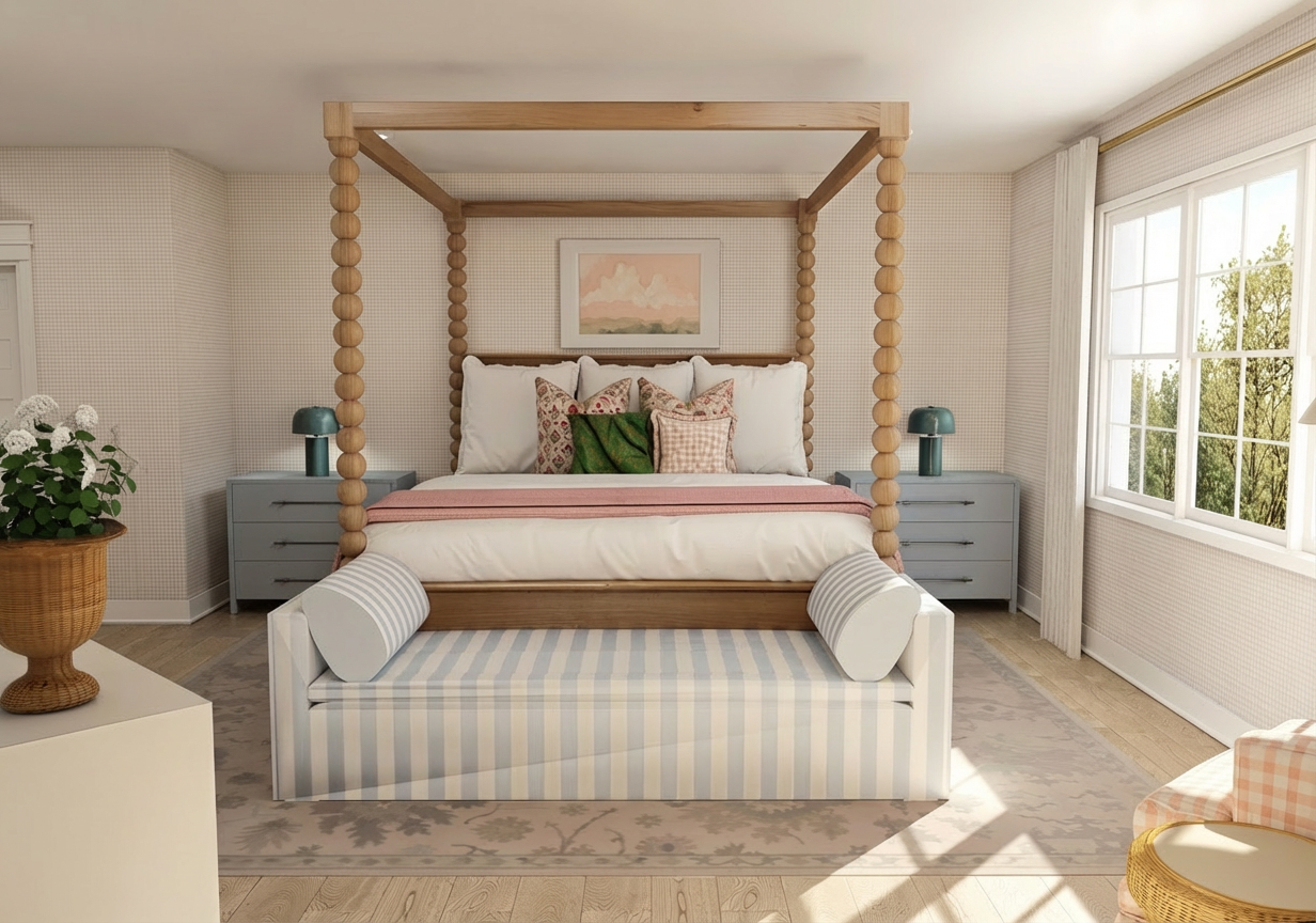 render a photo realistic shingle style low country home with off white shake siding brown roof white trim with wet paver driveway lush landscaping keep all the details and geometry as is