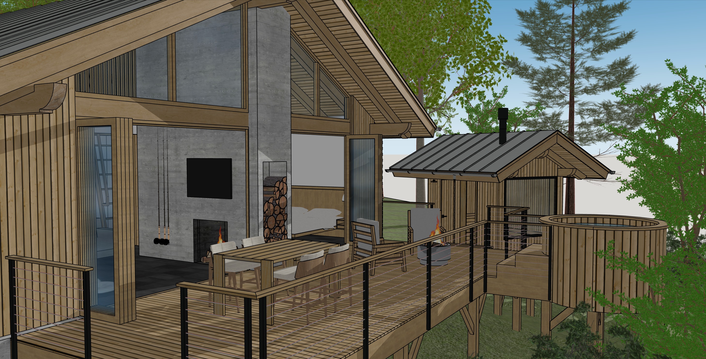 add additional trees forest behind the building the sunlight should be comimg from the back please add dark green non flowering rhododendrons below and in front of the porch building