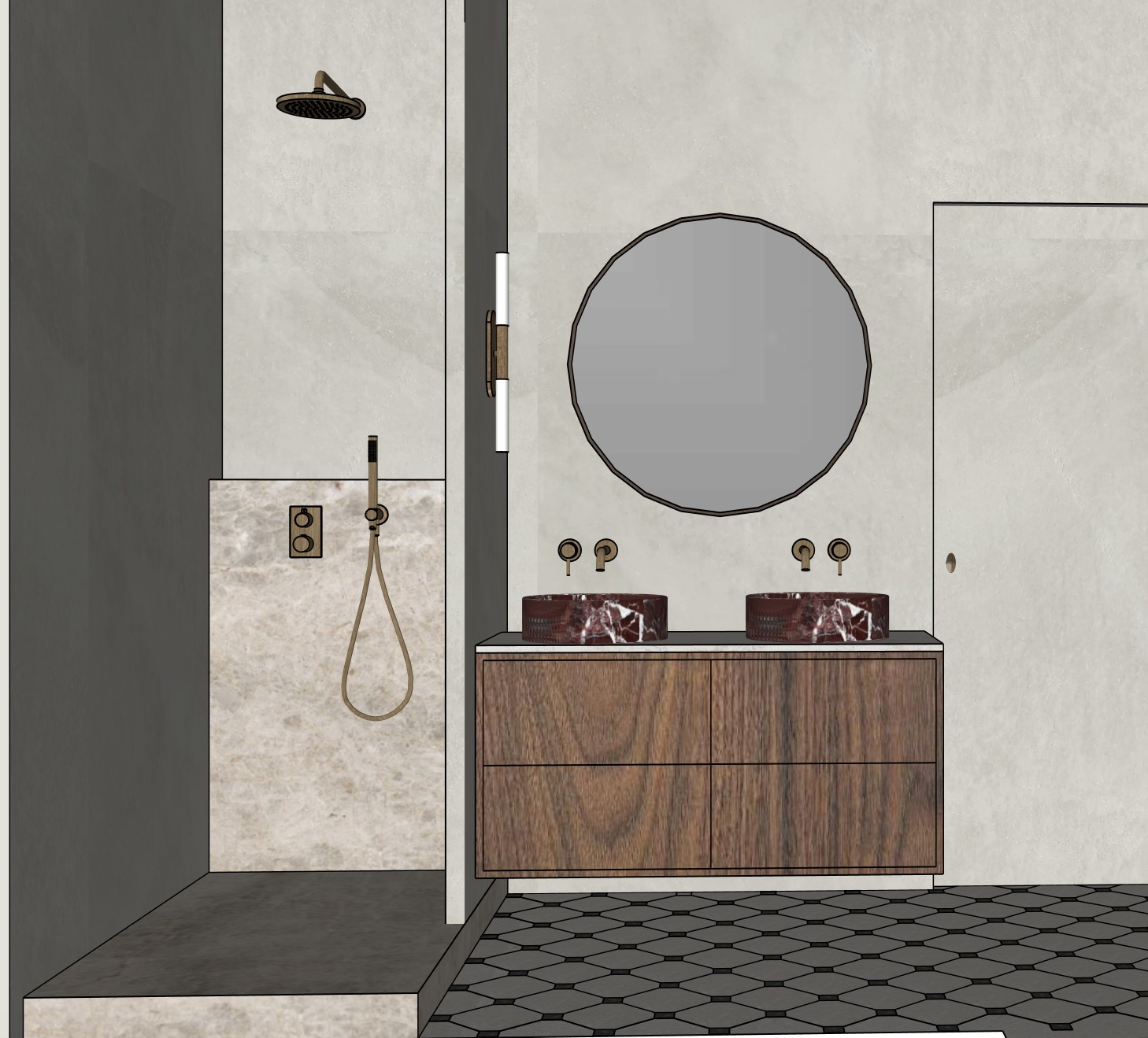 the walls are lightly plastered in light greige the sinks are in rosso levanto marble the floor in front of the vanity is black and white cabochon like this one https www c negoce com art carrelage en pierre gala octogone a cabochons 1018 htm srsltid afmboooy76vpyj3h6lxr34o1lf453rkpru kbvmegzlztgzfqcupnvx0 the vanity is in walnut the floor of the shower is in travertin silver like this one https www italiangres com fr roma vein travertin grandes dalles 6358 roma vein silver travertin mtr 5002 160x320 matt 6 mm html tp googleshopping country fr gad source 1 gad campaignid 20350090010 gbraid 0aaaaad7rxmrfqrmnob ciutruoljmple gclid cjwkcajwwjzpbhbreiwajfhrnujdwfbq z50spamdgfq fpjzzko8him2nf hini3oasb1mb0r3rzxoc5vyqavd bwe