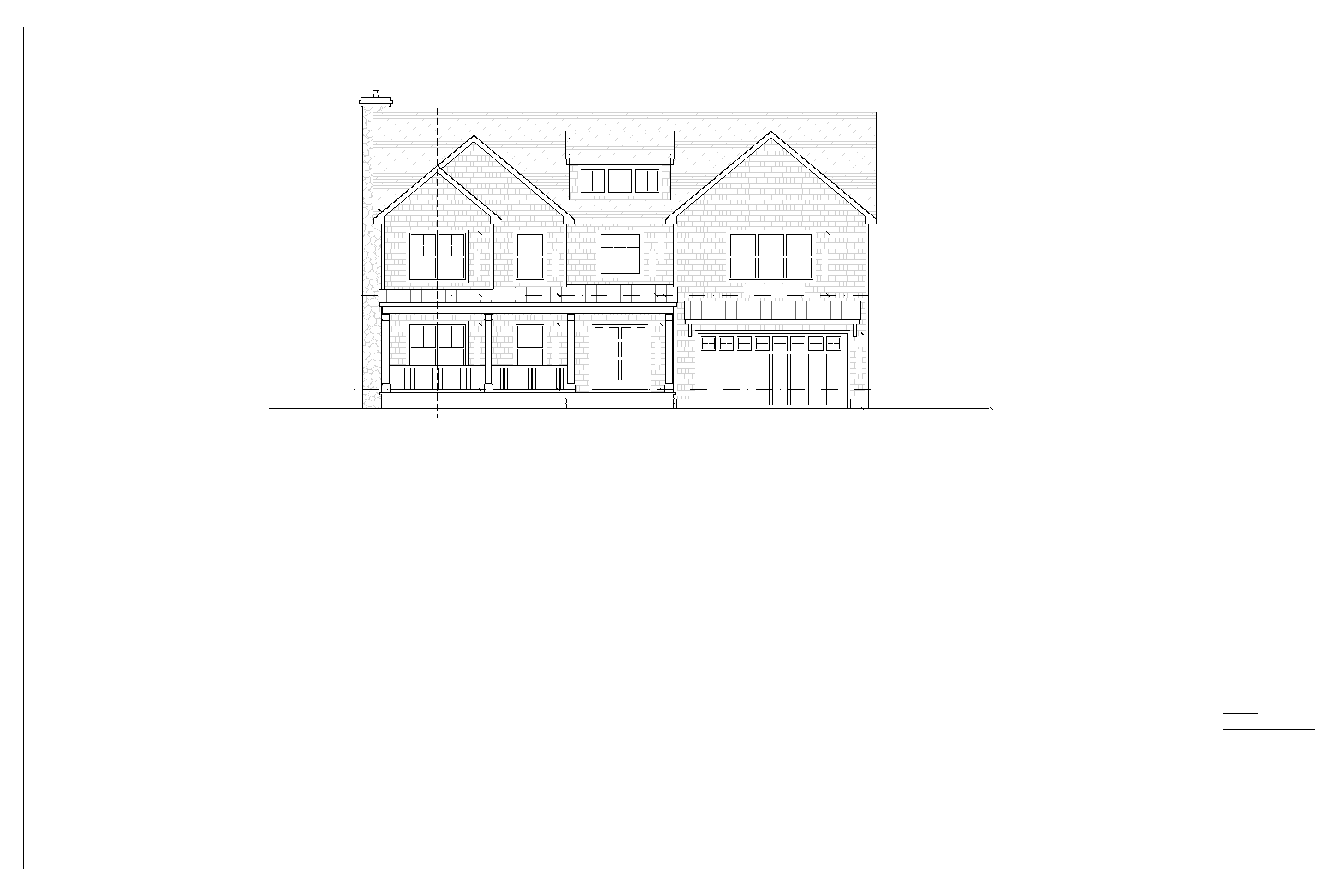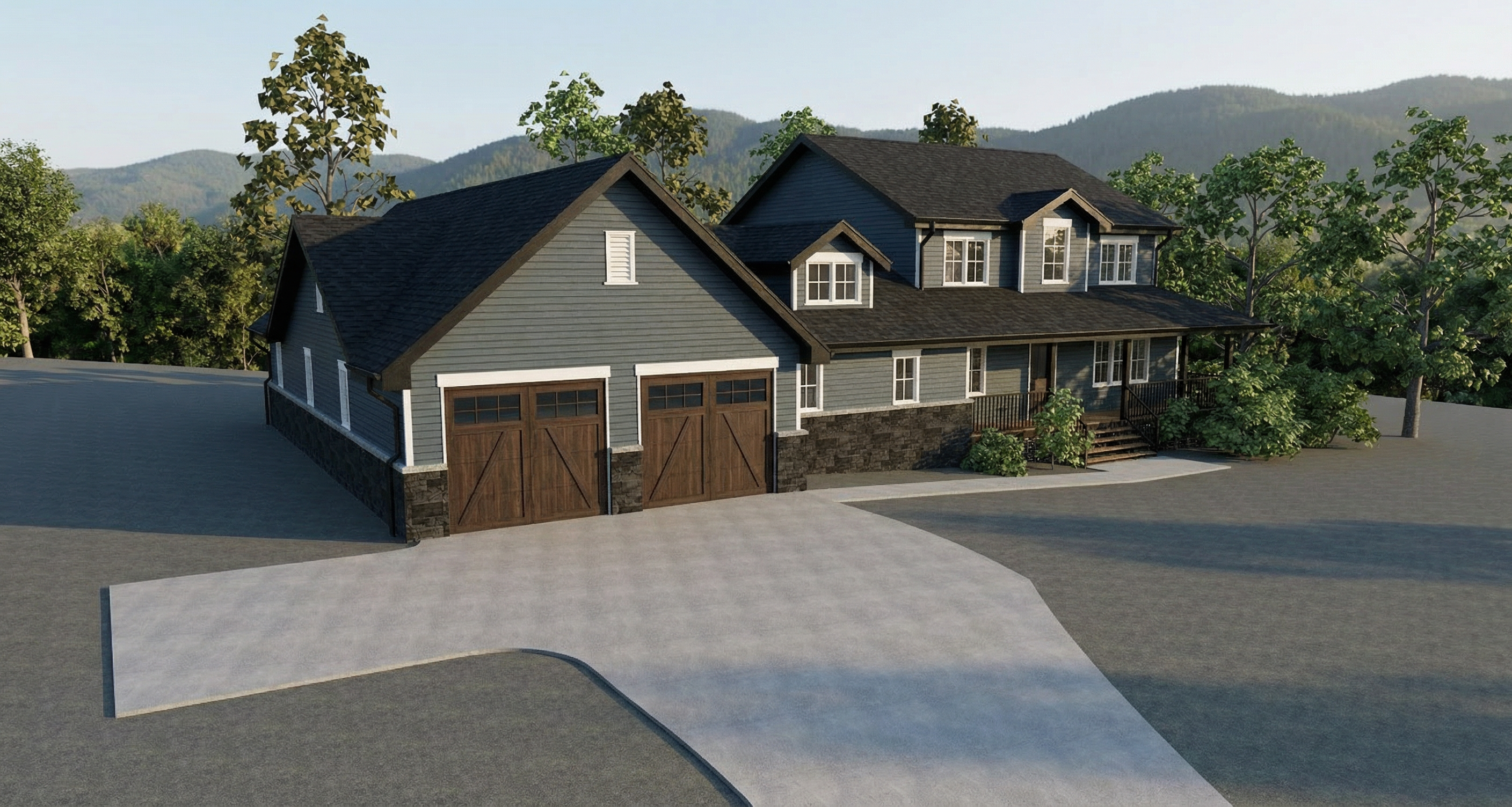 white house black roof in a forest all siding in roof peaks and above the garage to be white board and batton with belly bands