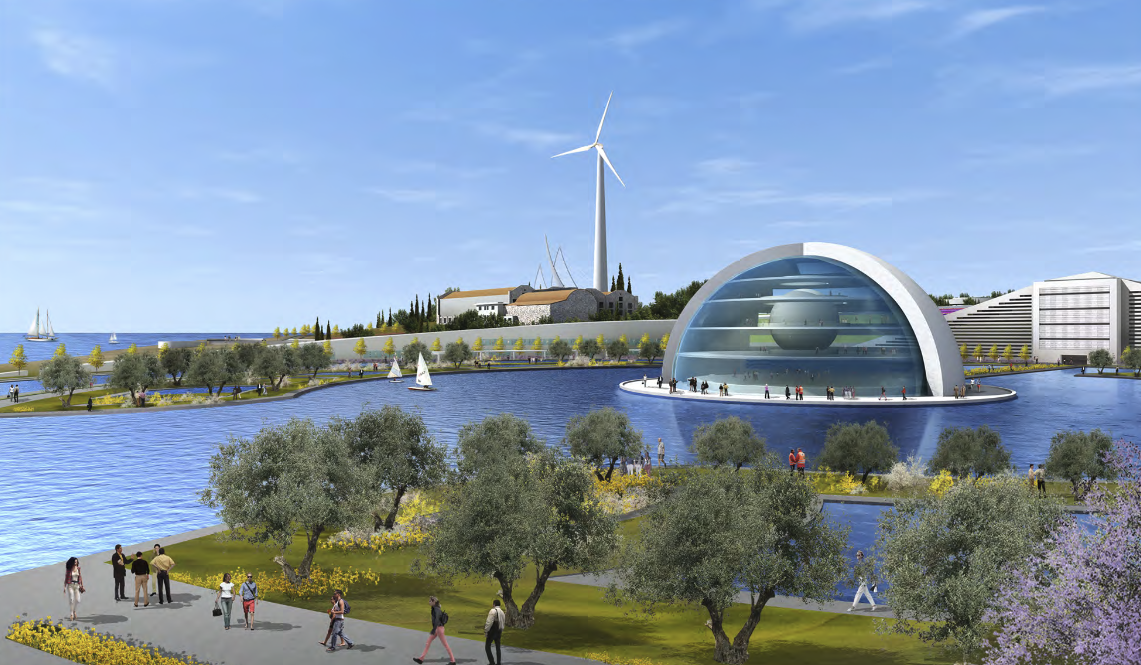 a futuristic coastal landscape with a serene atmosphere show a vast blue ocean meeting a clear sky creating a tranquil horizon include lush greenery with vibrant green trees lining the waterfront and yellow leaved trees adding contrast depict a modern bridge with sleek white arches and flowing lines complemented by a large white wind turbine symbolizing renewable energy the architecture is modern and eco friendly with circular designs and soft grey and white hues capture the essence of a calm sunny day with sailboats gliding gracefully on the shimmering blue water