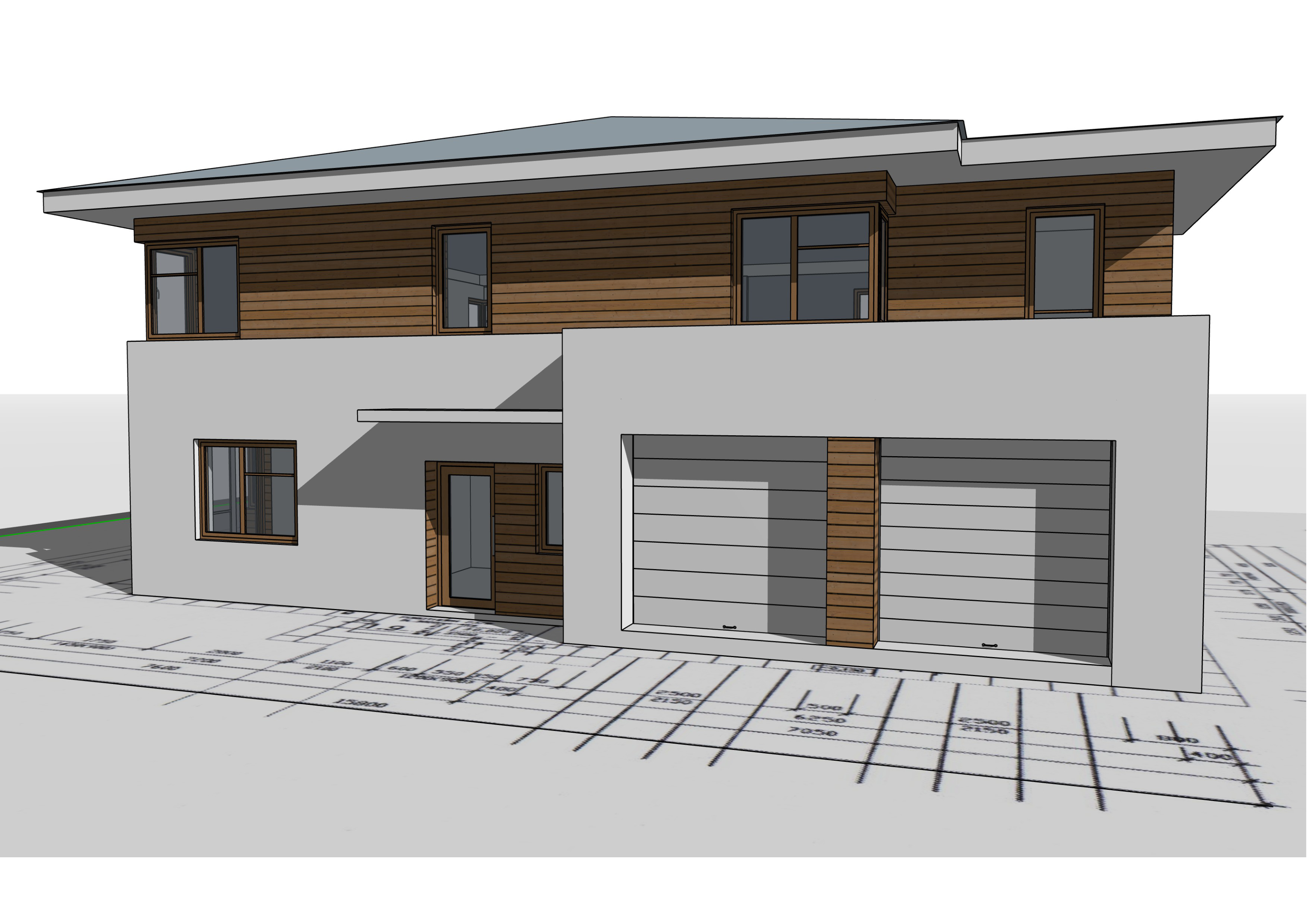 ultra photorealistic architectural visualization generated from the reference image preserve exactly the same architecture camera angle perspective geometry proportions and composition as in the reference important rule do not redesign the building do not add new elements do not remove objects do not change materials or colors only enhance realism architecture description contemporary two storey modern house ground floor finished with smooth white plaster facade upper floor clad with horizontal natural wood siding in warm medium brown tones flat roof with wide white roof overhang and grey roof surface exterior spiral steel staircase connecting the ground floor with the upper terrace curved metal railing following the spiral geometry concrete base platform below the staircase upper terrace with minimalist metal railing rectangular windows with wood frames matching the wood cladding ground surface showing architectural drawings and plans exactly as in the reference image lighting realistic natural daylight soft sunlight from the right side creating long architectural shadows physically correct lighting and reflections rendering quality ultra realistic architectural visualization physically based rendering pbr global illumination high dynamic range lighting subtle ambient occlusion realistic wood grain texture micro surface plaster texture accurate metal reflections on the staircase realistic glass reflections architectural photography realism cinematic architectural lighting extremely detailed materials 8k ultra realistic render maintain exact geometry from the reference image increase realism only