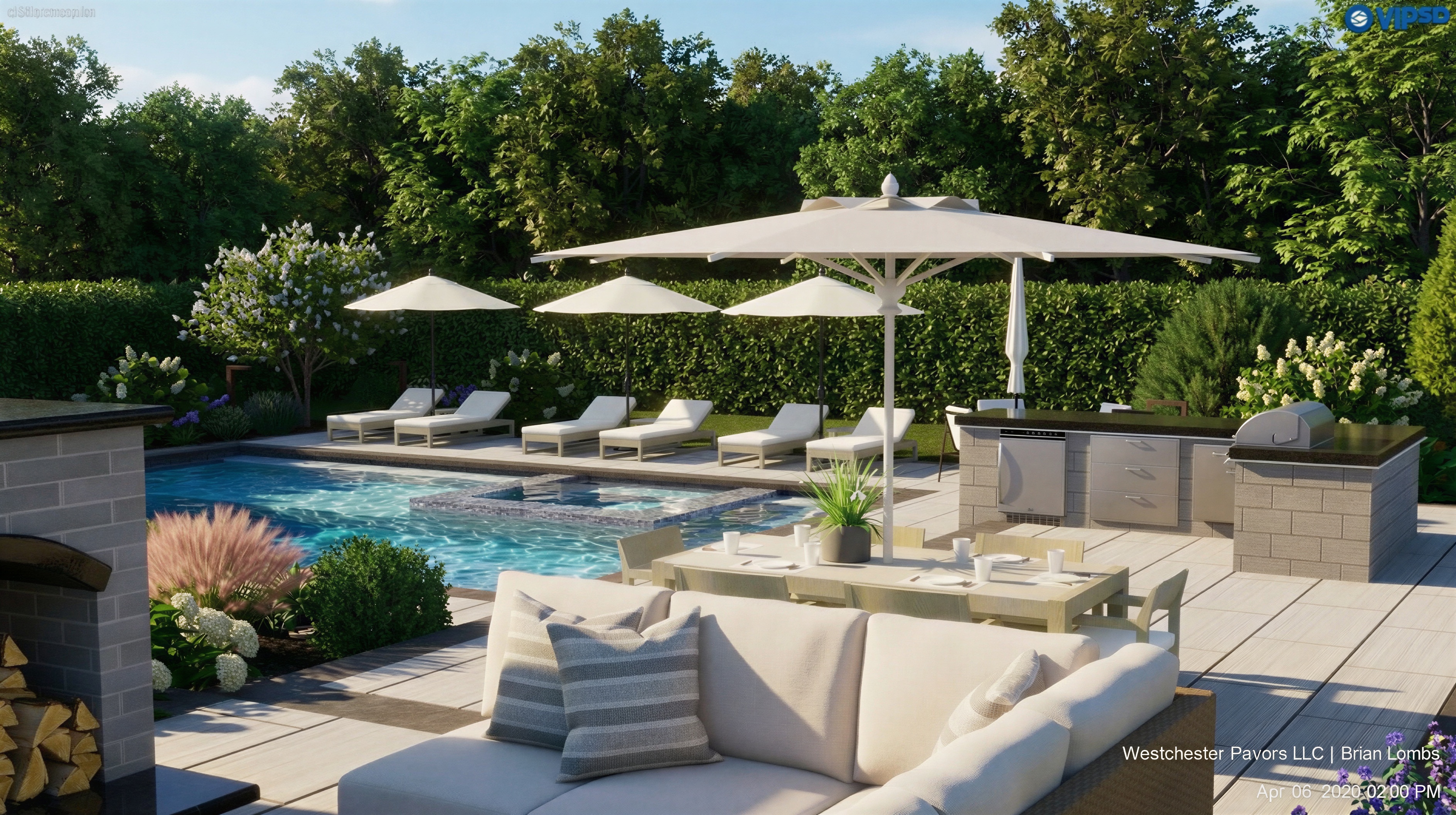 make a hyper realistic 8k render of this outdoor living space and angle remove the hedges for hydrangea snowball mature