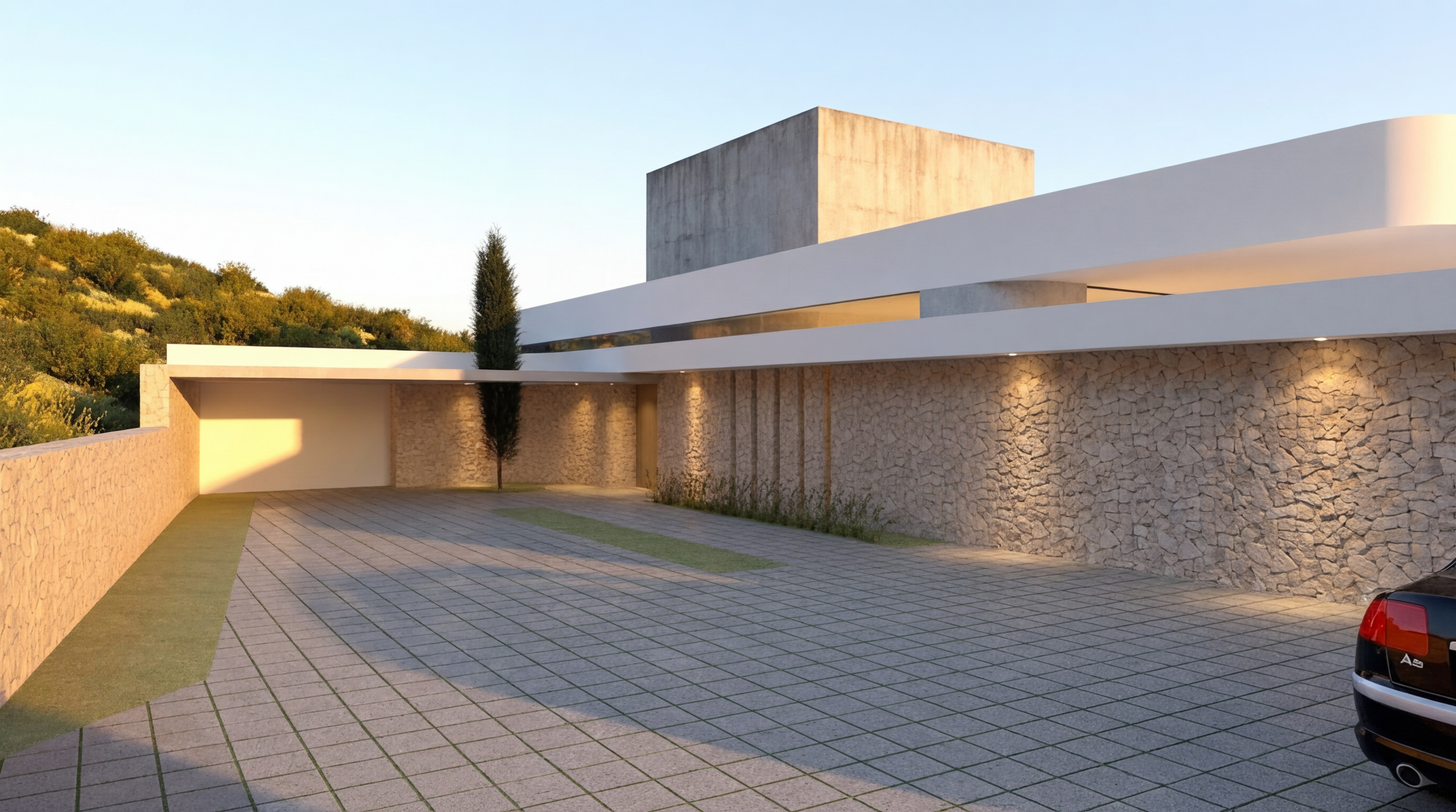 use the provided image as strict base reference preserve the original architecture composition camera position framing proportions and scene layout exactly as they are do not redesign reinterpret or add remove elements objective enhance the image to achieve a high end architectural editorial look refined poetic visually rich and photorealistic without altering the original design materials textures refinement improve realism of all materials stone plaster metal glass pavement add subtle micro texture and natural imperfections introduce slight tonal variation to avoid flat or repetitive surfaces maintain material authenticity no stylization no exaggeration avoid overly sharp noisy or artificial textures light atmosphere strict control preserve the original light direction and logic exactly do not change sun position or shadow orientation refine lighting to be more natural and photographic softer highlights balanced contrast gentle shadow transitions introduce a subtle atmospheric depth very light haze if needed avoid dramatic cinematic or artificial lighting effects reflections surfaces make reflections more physically accurate and slightly softer avoid mirror like or overly perfect reflections ensure correct roughness on all materials color grading apply a subtle editorial color grading slight desaturation for realism maintain a natural warm mediterranean tone if applicable avoid hdr look or excessive contrast vegetation context slightly reduce artificial appearance of vegetation add natural variation in tones and density keep everything controlled and not overgrown overall style architectural digest high end european editorial photography clean calm intentional composition poetic but restrained photorealistic not cgi looking critical constraints very important no change in architecture no change in composition no change in camera or framing no change in proportions no change in layout no added or removed elements no change in light direction no exaggerated textures no dramatic effects