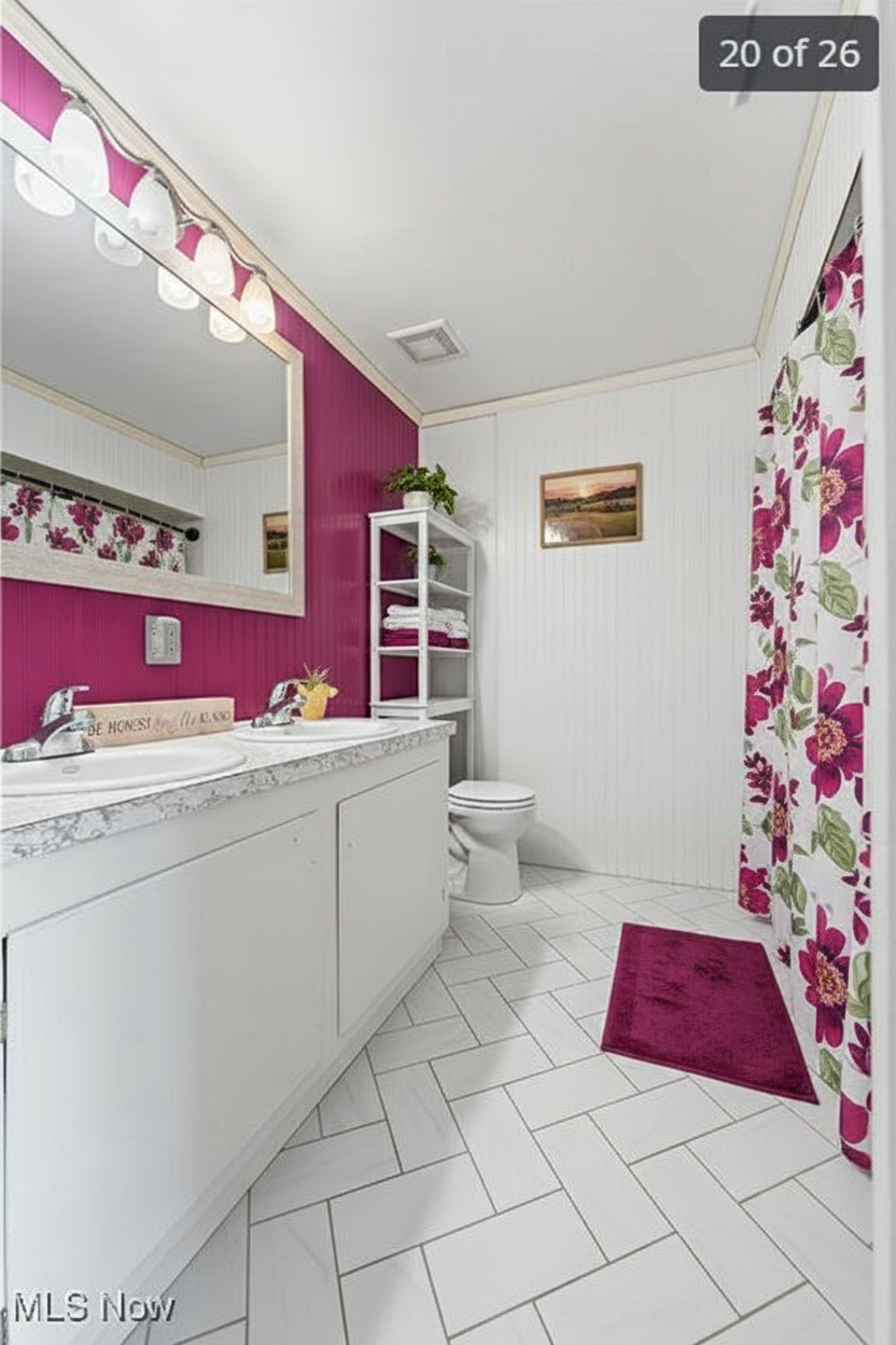replace the back wall with a tasteful floral wallpaper paint the rest of the walls a color shade that matches the wallpaper add a queen bed a rug a stylish dresser and some plants and framed art to decorate the bedroom
