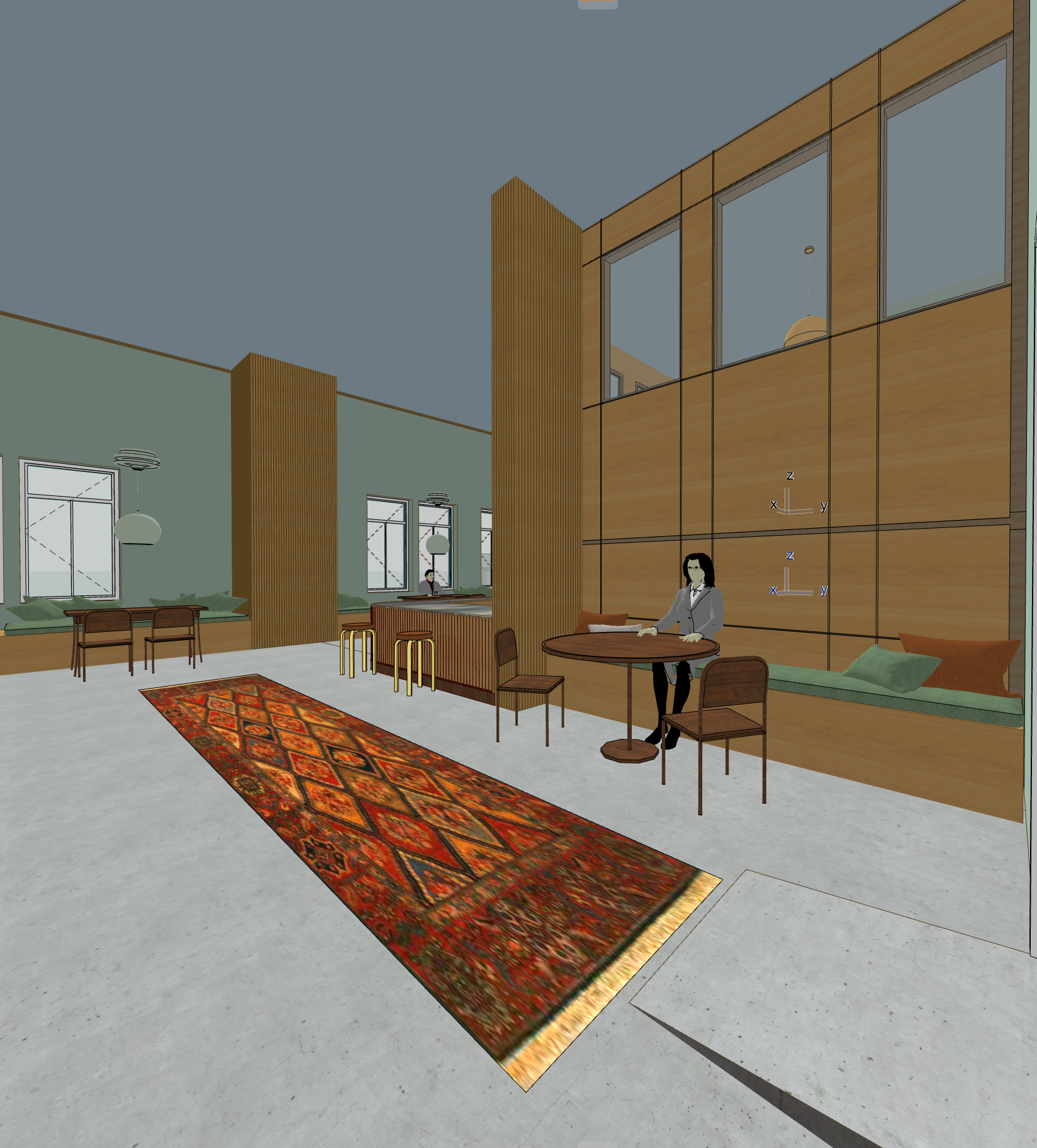 this is the entrance into a office space the wood is a light oak keep true to the image add some shelfs with soft led lighting the floor is polished concrete keep the wall colours the same keep the same ceiling colour