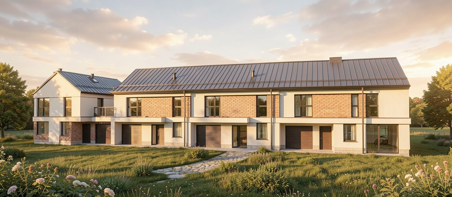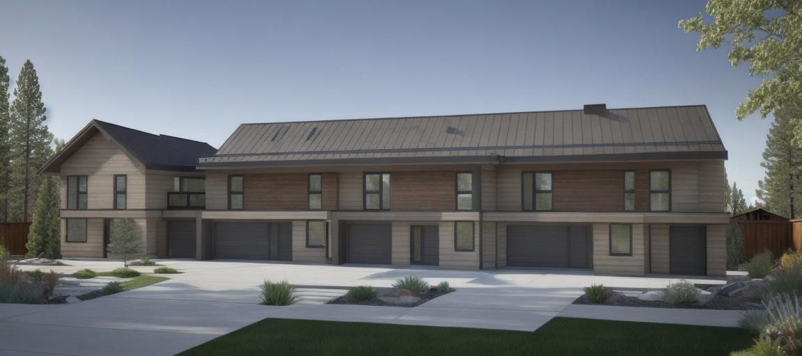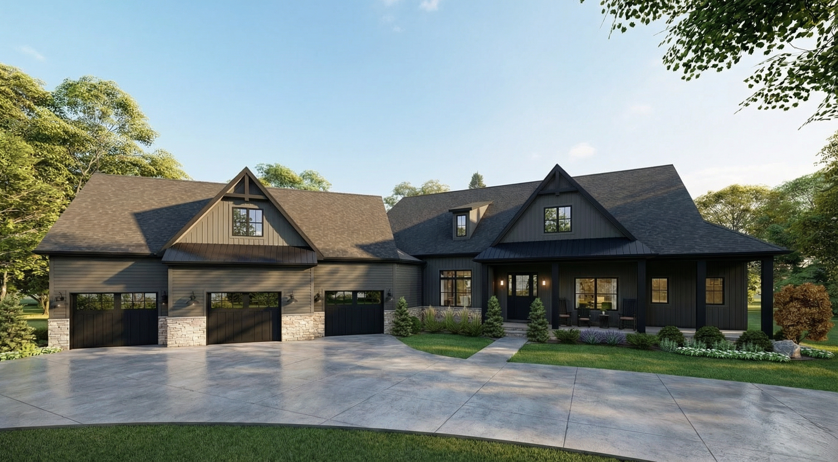 luxury mountain modern ski home grey wood siding with low rustic stone base at sunset