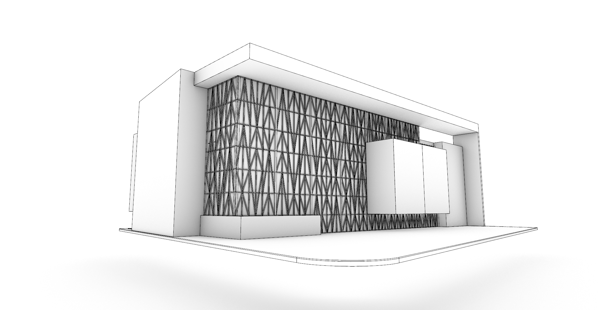 exterior shot a convention center in elche alicante features a glass facade and leaf green metal uprights the opaque volumes are made of stone with a herringbone shaped bas relief texture the plaza s ambiance should be dynamic with palm trees and paths with water foil platforms