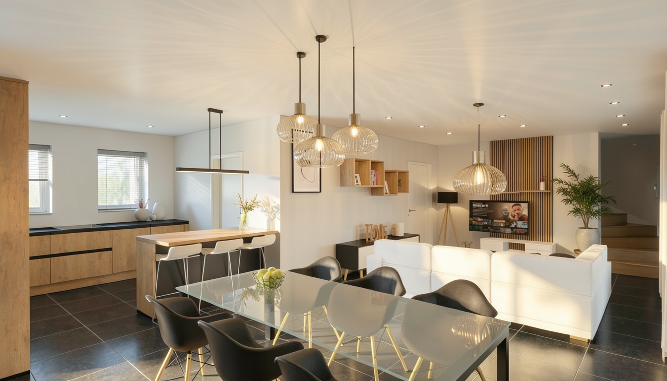 luxury contemporary living room interior with a clean modern transitional style with sloped ceiling featuring a dramatic floor to ceiling window wall on the right side with a symmetrical grid of white mullions and clerestory windows on either side of the fireplace exterior view shows a bright california desert landscape with warm sandy terrain sparse desert vegetation cacti and distant low mountains under a clear blue sky show a 6 high plaster wall with lush succulent landscaping in front of it it should be subtly evident that there is a pool just to the right outside of the high windows interior palette is soft neutral and high contrast warm white walls light beige tones and deep espresso near black wood flooring with a matte finish large format light gray stone tile fireplace wall with subtle horizontal veining linear gas fireplace with a sleek black firebox and integrated built in shelving niches in dark wood with curated decor objects ceramics books glass vases sculptural pieces furniture layout is centered and symmetrical a low profile modern white upholstered sofa with clean lines paired with a reflective mirrored glass console table behind it soft white textured area rug beneath adding warmth and contrast to the dark flooring minimalist decor on the table including a metallic sculptural object ceiling is tall and airy with recessed can lighting and a large contemporary sputnik style chandelier with multiple arms and cylindrical shades in brushed metal finish centered in the living space soft natural daylight floods the space balanced with warm artificial lighting window treatments are full height soft drapery panels in a pale muted green gray tone hung high and wide to emphasize verticality black accent wall column spanning left to right with large format glossy panels creating contrast and a modern architectural feature materials and finishes matte painted walls polished stone tile fireplace dark stained hardwood floors brushed metal lighting fixtures soft fabric upholstery glass and mirror accents lighting bright natural daylight with soft shadows warm interior lighting photorealistic global illumination camera wide angle interior shot eye level perspective centered composition ultra realistic high dynamic range sharp focus architectural visualization quality