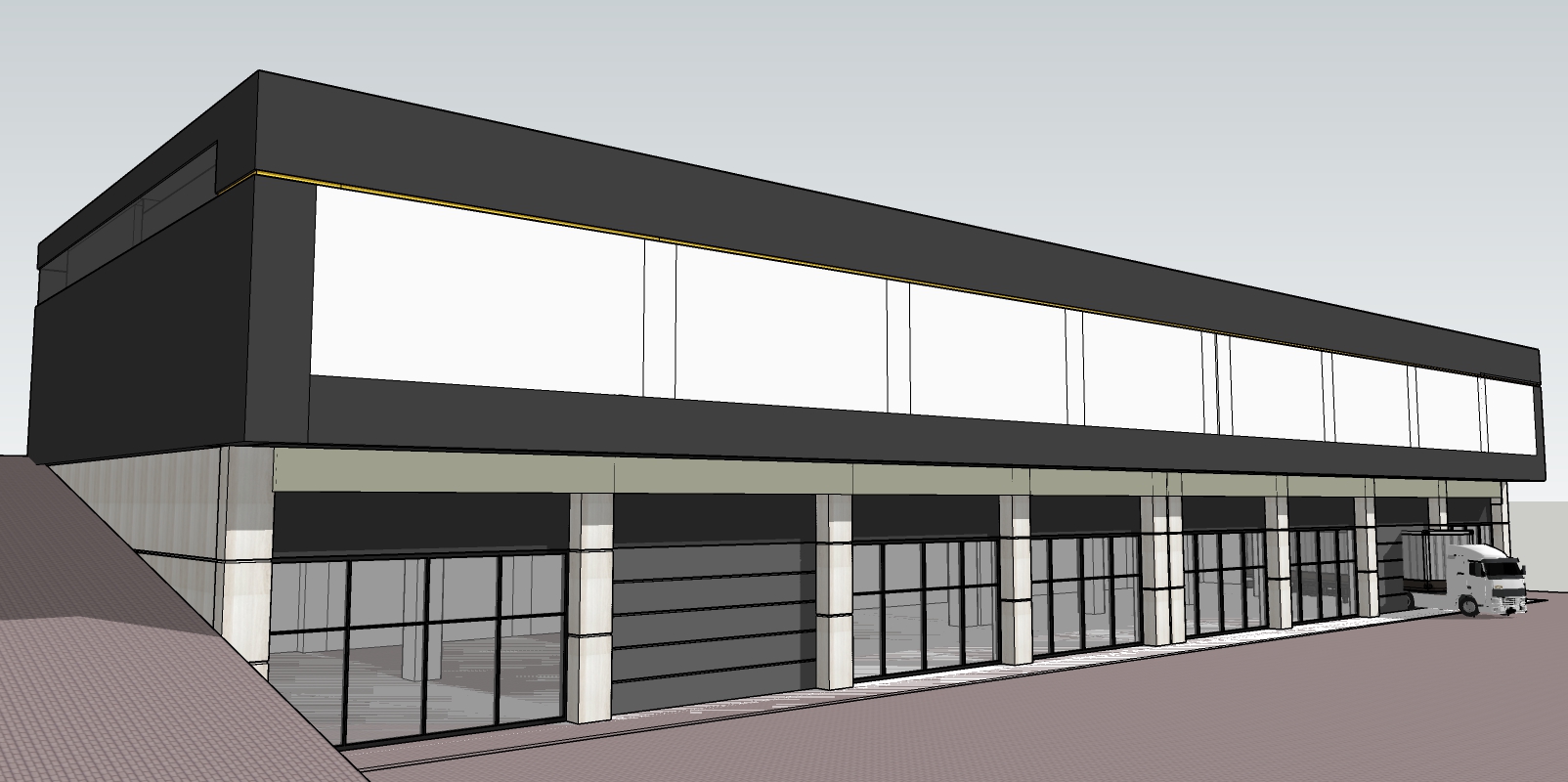 modern warehouse archutectural visualization vray render professional light setup led light large loading park lift and truck beige wall in first floor light led facade