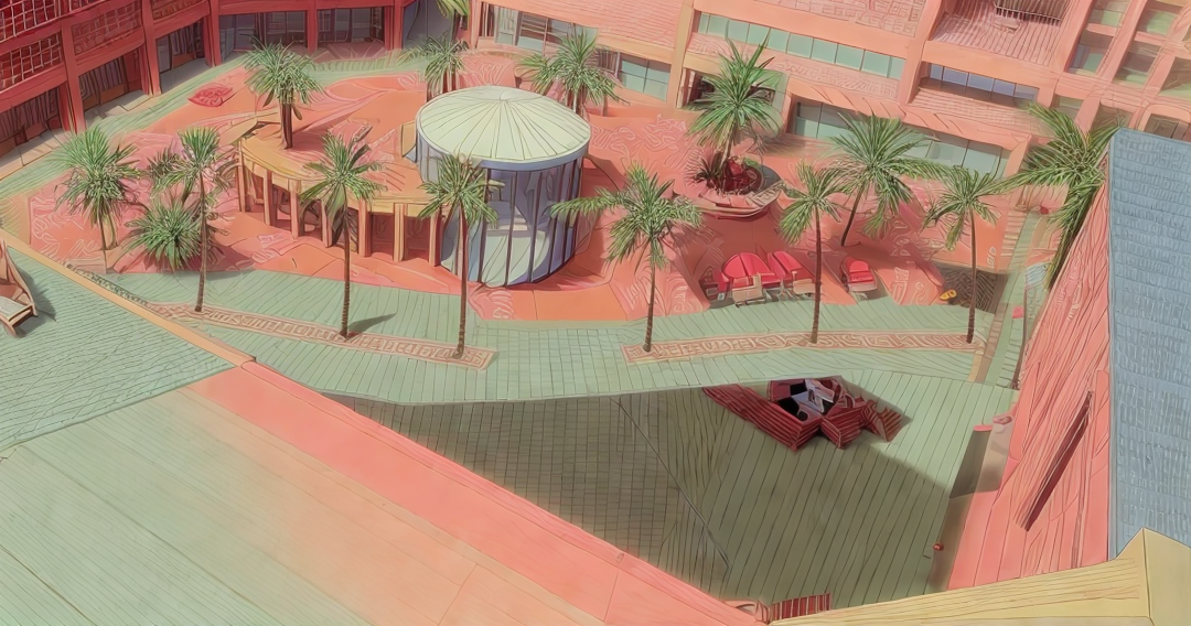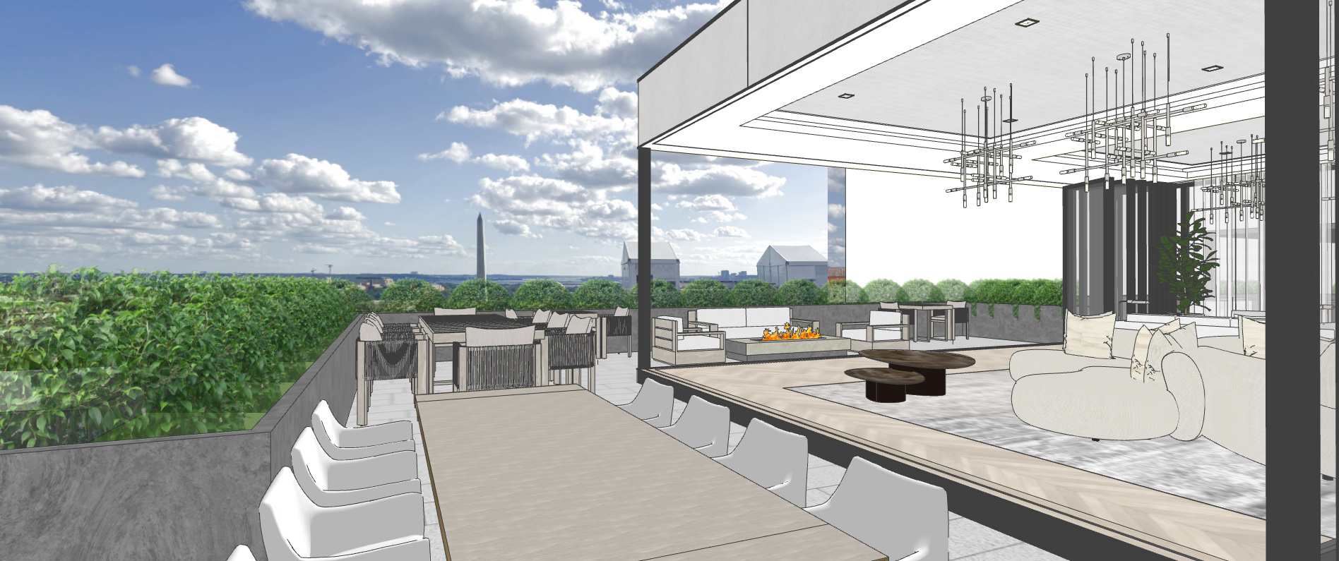 render a sophsicated luxurious penthouse roof deck overlooking the washington monument with business people lounging and enjoying the view the interior has white ceilings and cove lightinging in the recessed tray ceilings