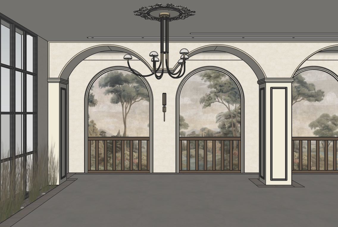 base photorealistic interior render of a high end mediterranean classical restaurant keep exact geometry camera angle proportions and original color palette from the reference image key corrections the arches on the back wall are not real openings they are flat wallpaper murals with painted landscape trees and nature framed by decorative moldings they must read as decorative surfaces not exterior views behind the camera there is a large glass window bringing soft natural light into the space the wall panels mirrors are aged antique mirror glass with subtle oxidation stains and imperfect reflections lighting very important warm lighting overall 2700k 3000k cozy and elegant restaurant mood hidden led strips on top of column moldings casting soft uplight baseboard under mirrors panels with integrated led casting soft downlight on left railings a hidden led strip on top casting light downward washing the railing natural light entering from behind camera soft shadows and realistic bounce light no overexposure balanced lighting materials preserve original tones beige cream warm neutrals light moldings dark continuous flooring wooden railings soft sheer curtains natural indoor plants render style ultra photorealistic global illumination ray tracing soft shadows ambient occlusion high detail textures cinematic lighting realistic reflections mood warm sophisticated intimate fine dining atmosphere