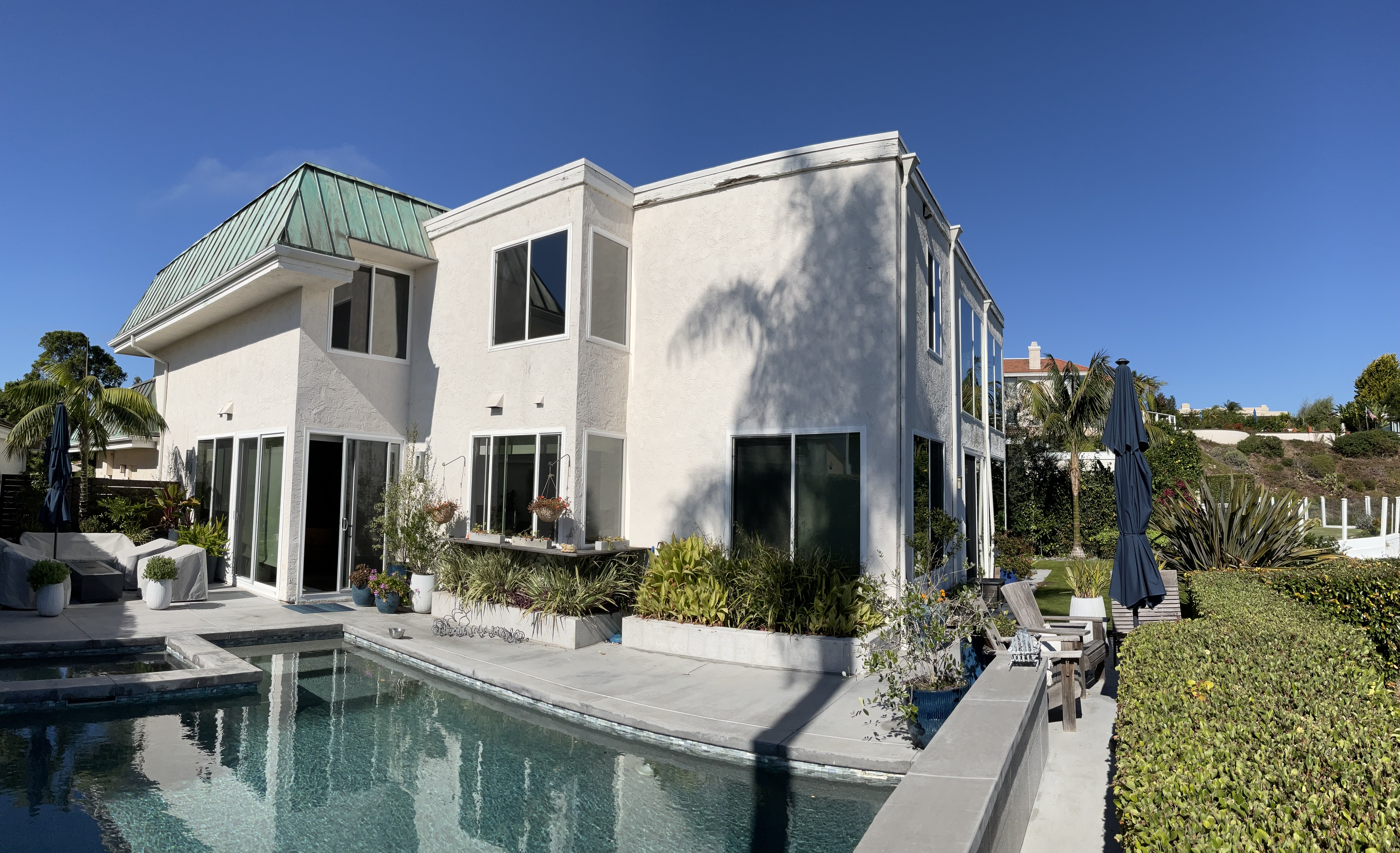 create a beautiful california scandinavian exterior with dark walls copper gutters and black windows and doors with warm sunset lighting and a mediterranean style landscape in the yard
