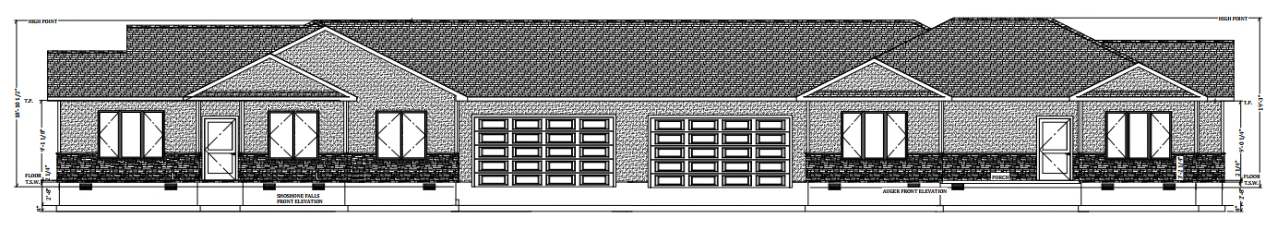 white stucco with white onyx stone skirt around whole unit minus the garage doors front door 3 4 glass black windows soffit fascia roof and garage doors do not change the structural plans and placement of windows do not add any columns show the entire unit as shown in the image uploaded