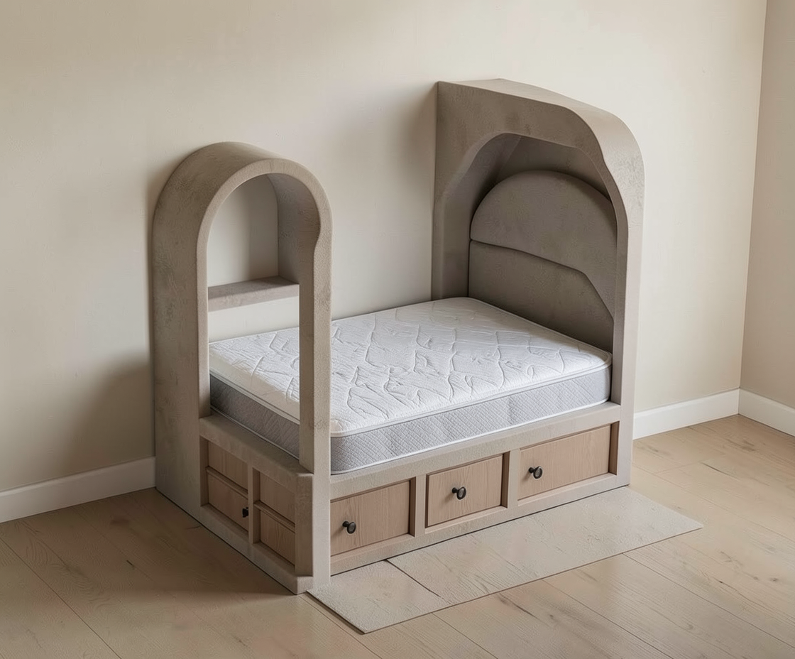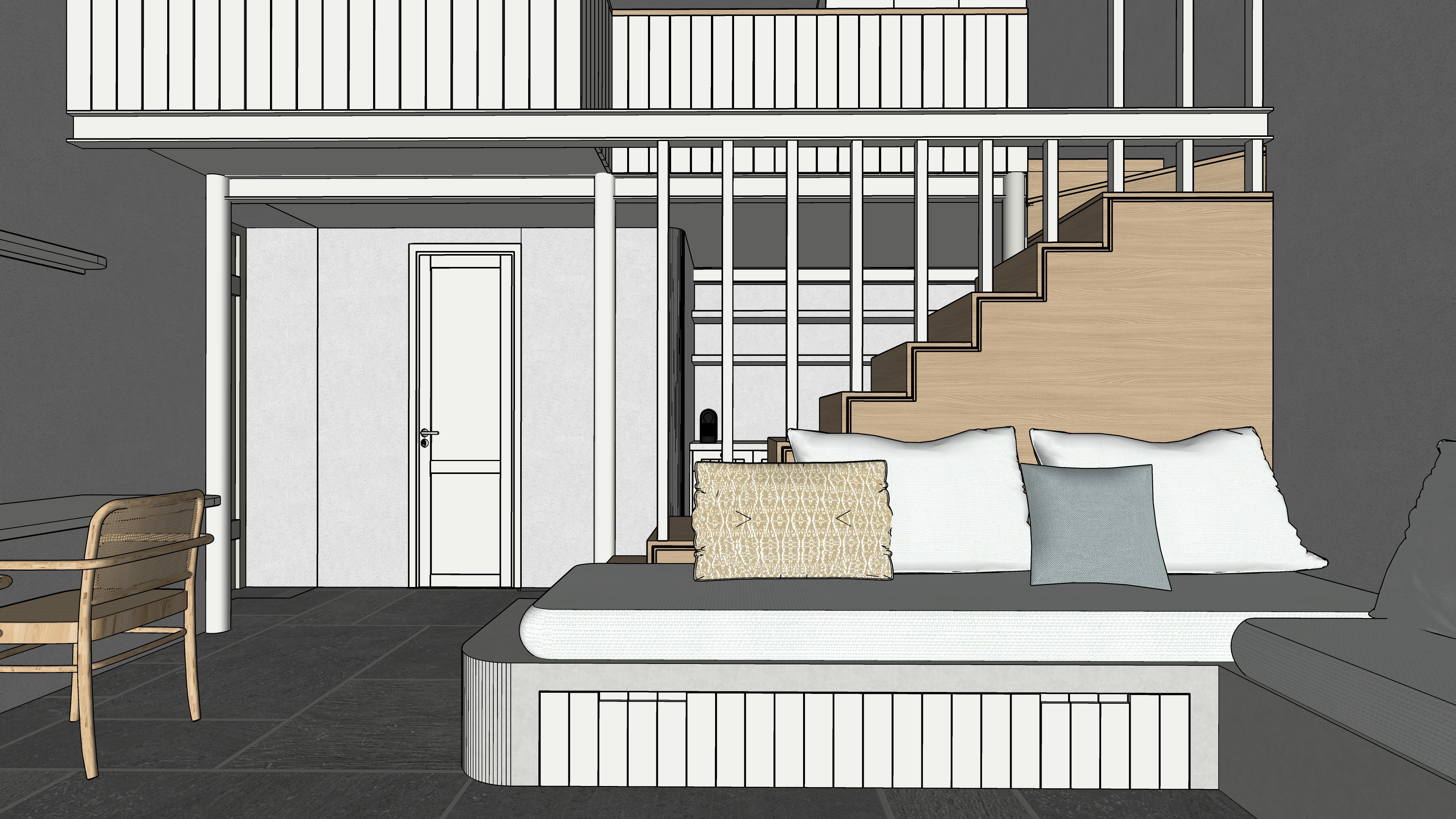 main prompt this is a cycladic house in kythnos the floor is natural gray pelion stone the sofa is white cement paint the sofa fabrics are light cream there is wooden stair leading to the mezzanine which is made of metal in white color and light oak wood the countertop of kitchen is white naxos marble the drawer underneath the sofa is white there is natural light negative prompt do not change geometry do not add pbjects do no change colors or materials