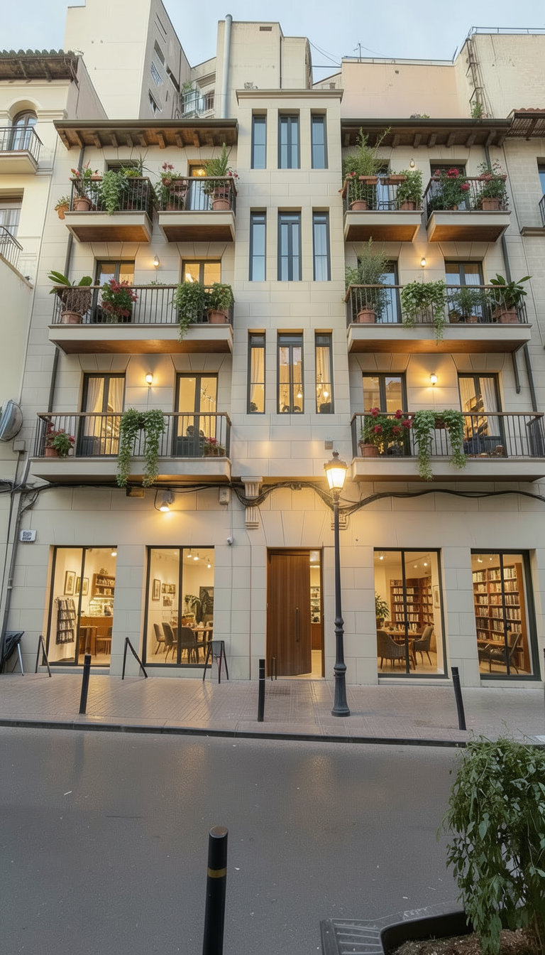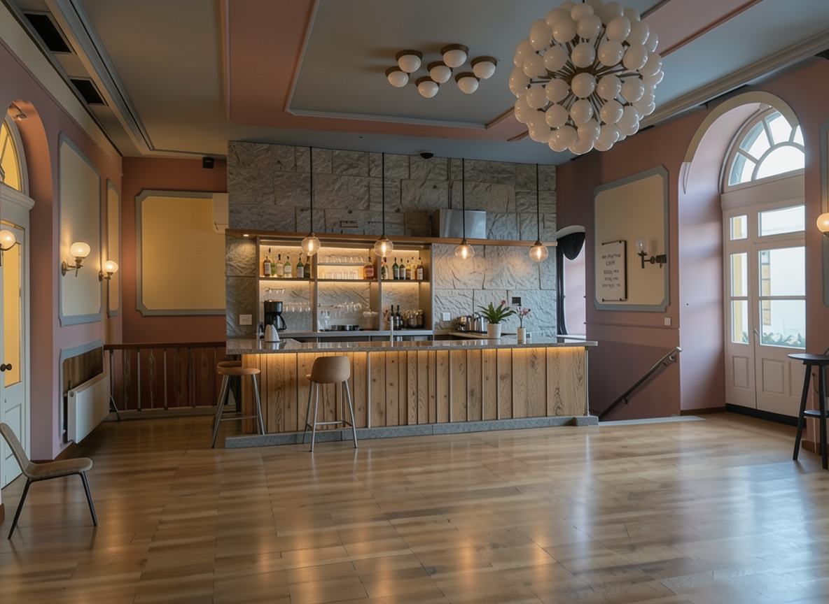 transform the dining room into a mediterranean organic living room while maintaining the large rounded arch as the central architectural frame create a full central island seating layout using a large sculptural curved sofa in warm beige linen positioned symmetrically in the middle of the room place an oval marble coffee table with bold natural veining inspired by the mood board at the center of the sofa apply olive toned limewash wall finish with subtle texture variation introduce walnut wood wall panels and built in niches inside the arch with warm indirect lighting and ceramic decor maintain herringbone oak flooring and add a large organic ivory wool rug extending beyond the sofa edges use layered plaster pendant lighting centered above the seating island add olive tree greenery and mediterranean accessories create soft natural daylight ambience with warm shadow and highly realistic textures