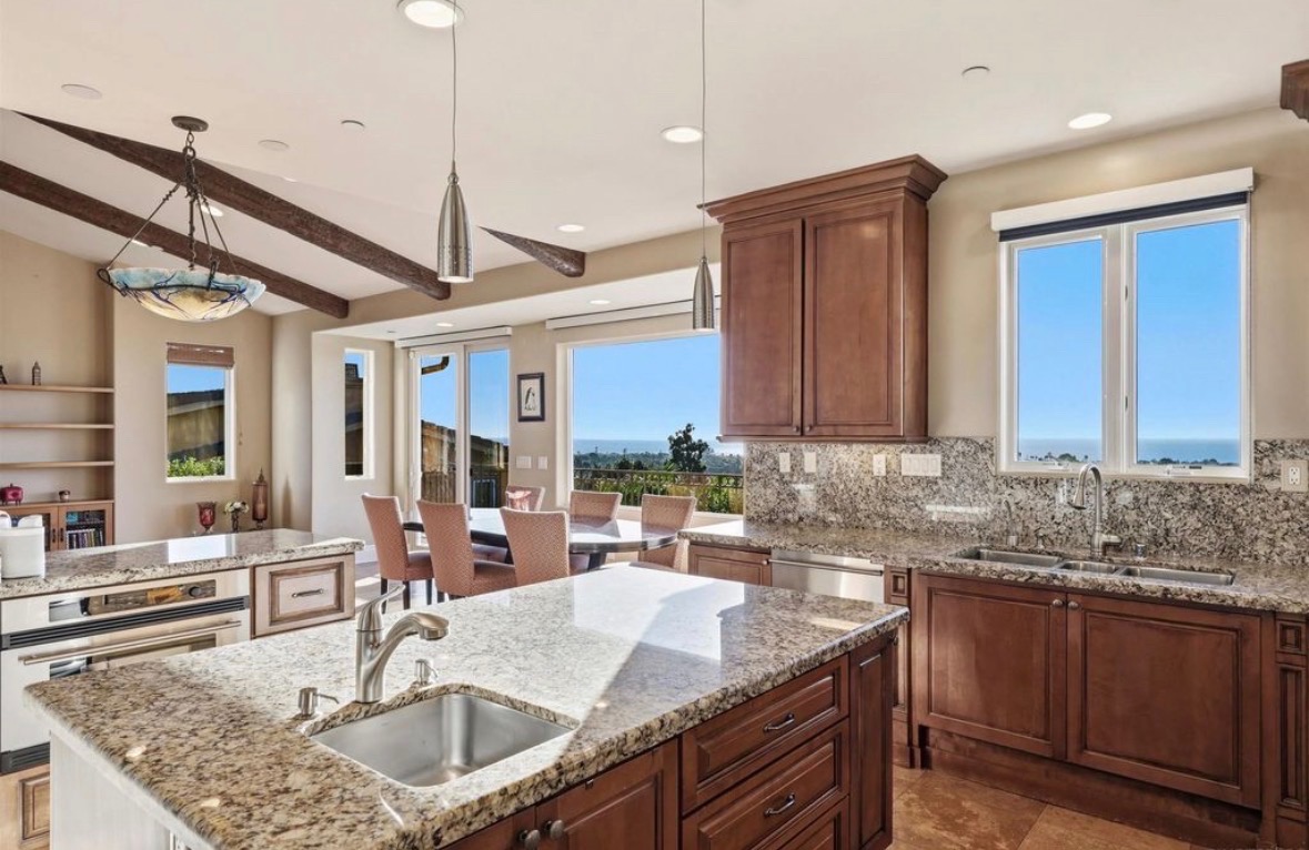 create photo realistic rendering of kitchen remove sink and faucet in island change faucet under window to modern black newport brass change backsplash to white zellige 2x6 tiles and install up entire wall around sink windowchange island countertop to poseiden countertop slab on the island benjamin moore midnight paint on all kitchen cabinets replace with 2 regina andrews claudia pendant 21x16 in white brass change all wall paint color to white change large round pendant for palacek green oaks oversized pendant