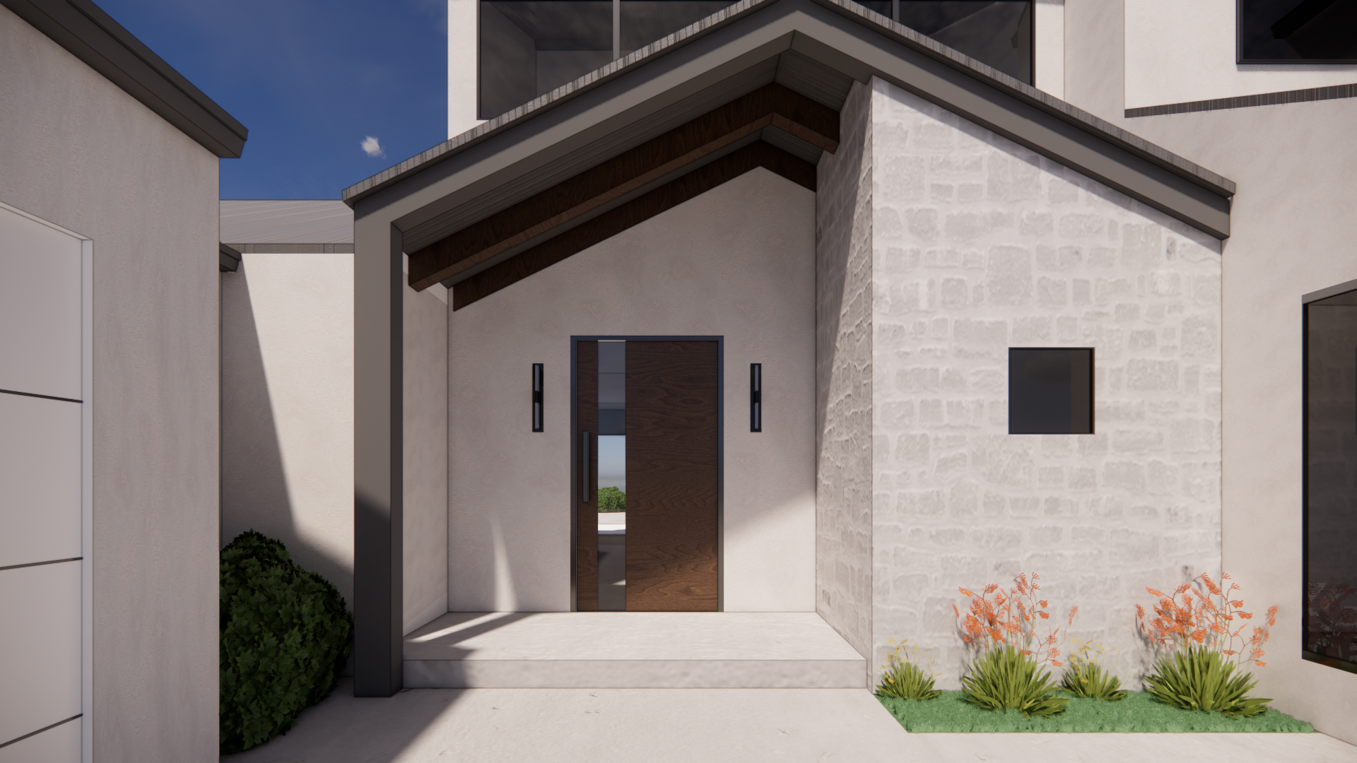modernist but dramatic exterior shot visualize a modern california style residential building with a contemporary design the building should have white stucco exterior walls and large window with black metal trim with sleek black accents along the edges the atmosphere should be dramatic morning scene sunshine light inside the windows sunlight casting soft shadows the surrounding landscape should include lush green shrubs and tall deciduous trees with autumn colored leaves architecture