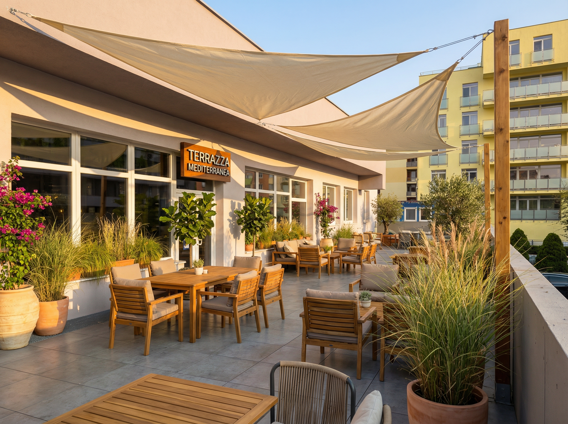 blue hour early dusk urban atmosphere after rain cool cyan blue sky with soft gradient and thin wispy clouds slightly hazy air wet asphalt and sidewalks with strong specular reflections and subtle puddles reflections of warm interior lights and street lighting on the ground warm amber yellow window glow 2700 3000k contrasting with the cool ambient 6500 8000k cinematic photorealistic high dynamic range deep but clean shadows controlled highlights no blown out windows crisp facade edges natural color separation teal orange slight bloom around bright windows and streetlights gentle vignette realistic white balance moderate contrast fine filmic tone mapping maintain original geometry context materials and signage only adjust lighting atmosphere exposure and color grading