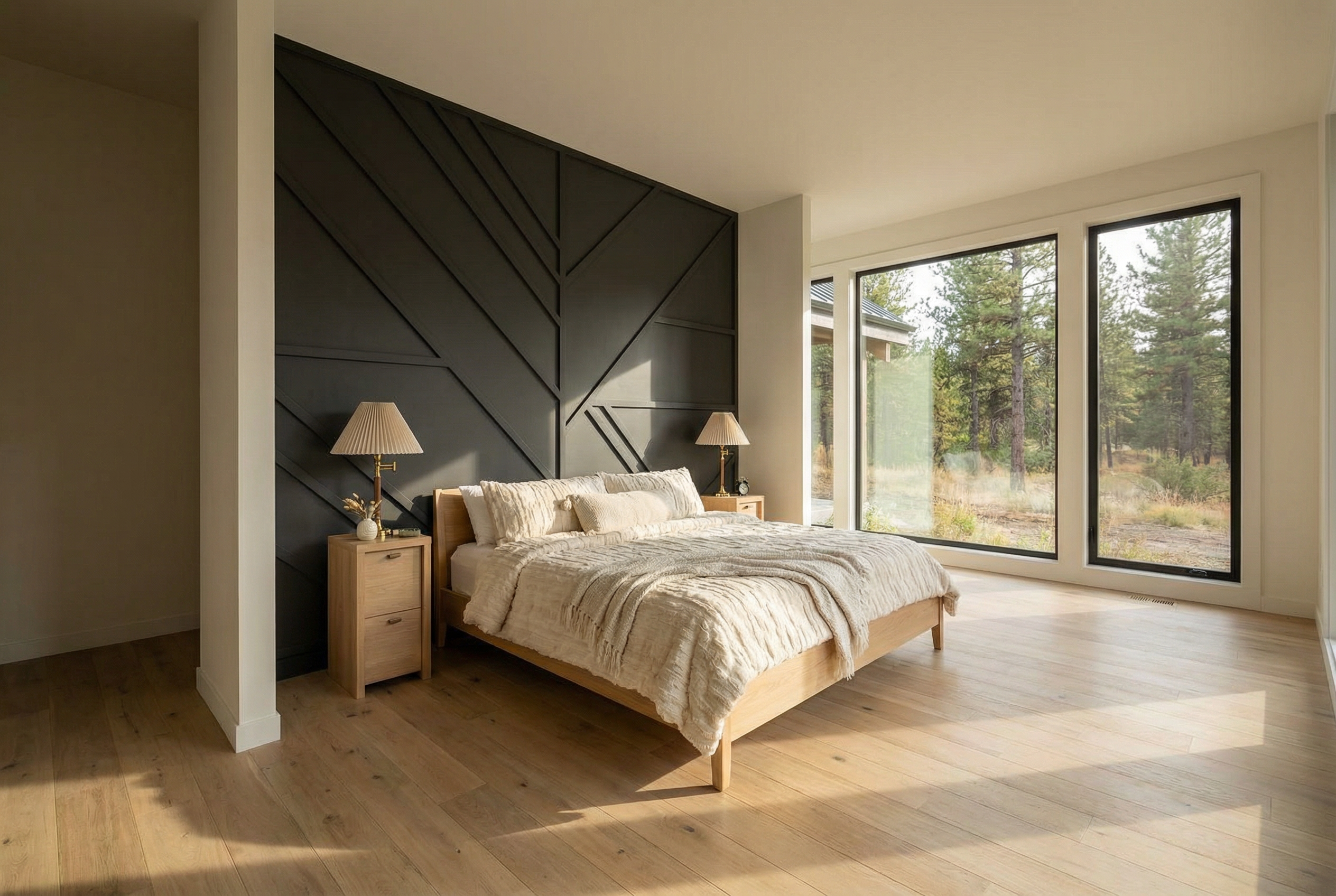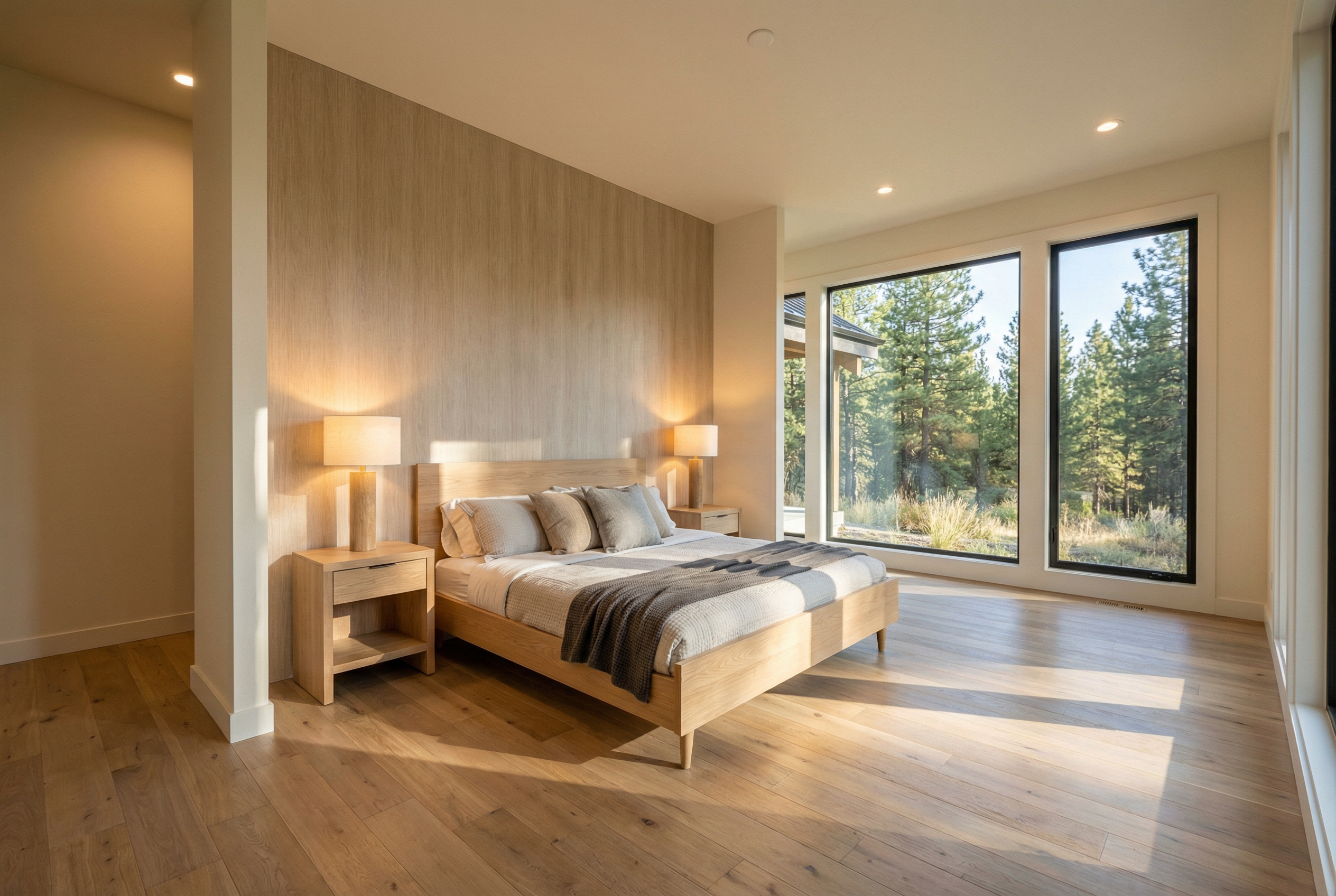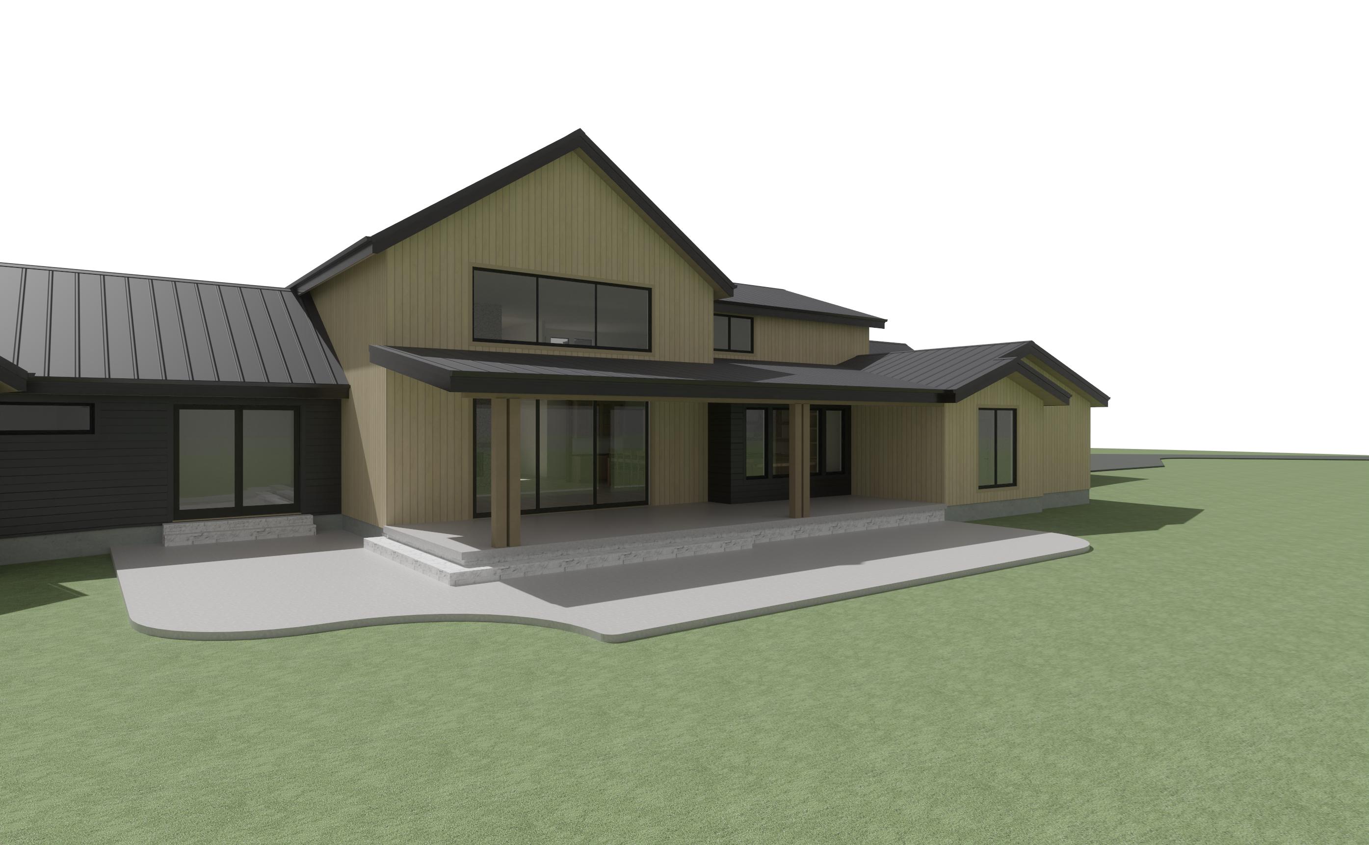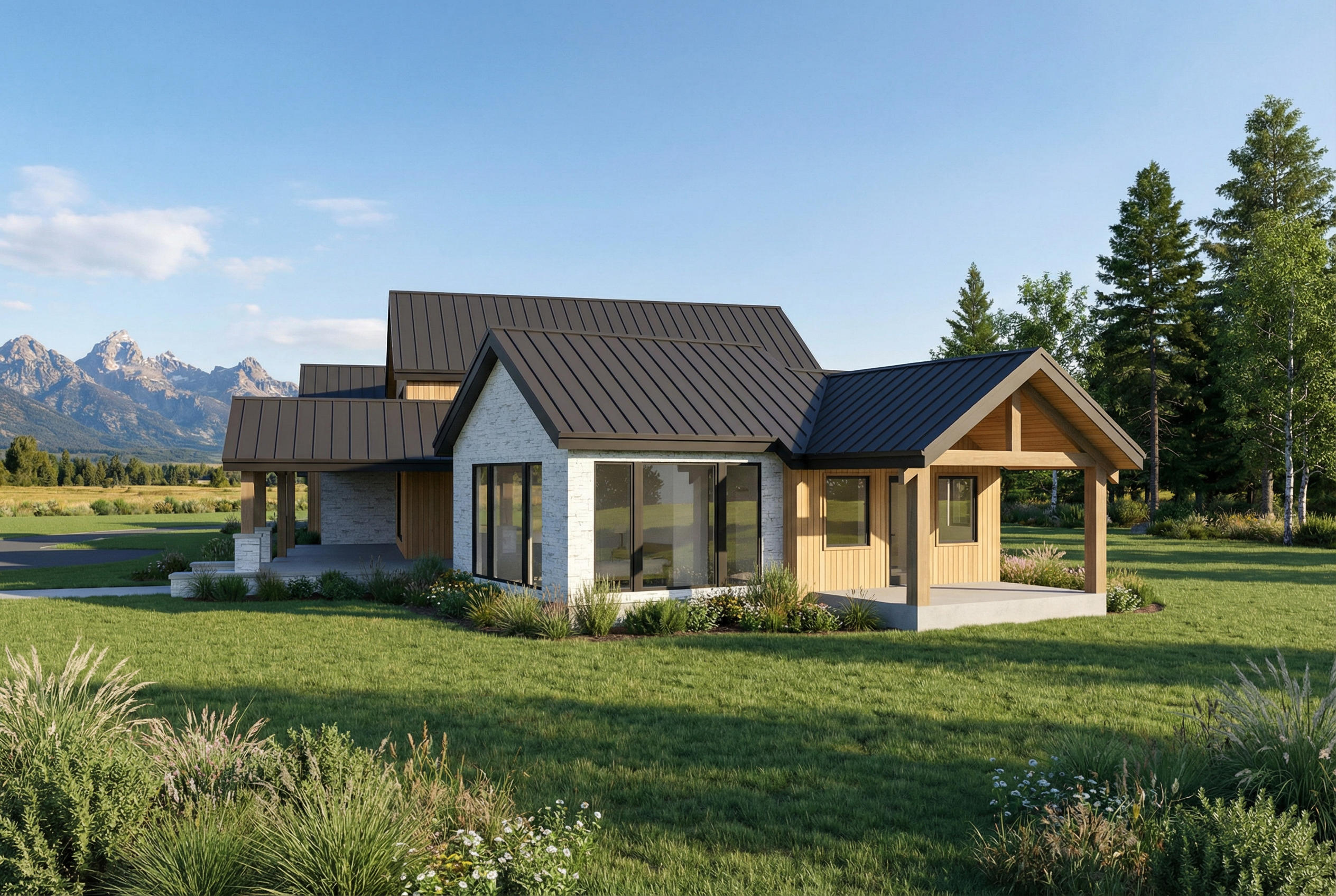 enhance the realism of the existing architectural design while maintaining the same materials and textures focus on realistic lighting shadows and surface details to create a lifelike appearance ensure the mixture of wood siding is preserved in the correct areas making them look authentic and cohesive this is in montana add montana landscape with nice landscaping near the house add montana vegetation around the house make wood siding modern vertical 10 wider plank siding natural cedar light warm honey tone clear matte finish clean sharp edges minimal knots contemporary scandinavian farmhouse style high end residential exterior the siding is not board and batten it is wide planks with realistic wood grain texture make the wood siding planks the same width as the image reference do not add a chimney add mountains far off in the distance do nice landscaping in front of house and and native montana vegetation in forground dont add chimney nice yard in foreground