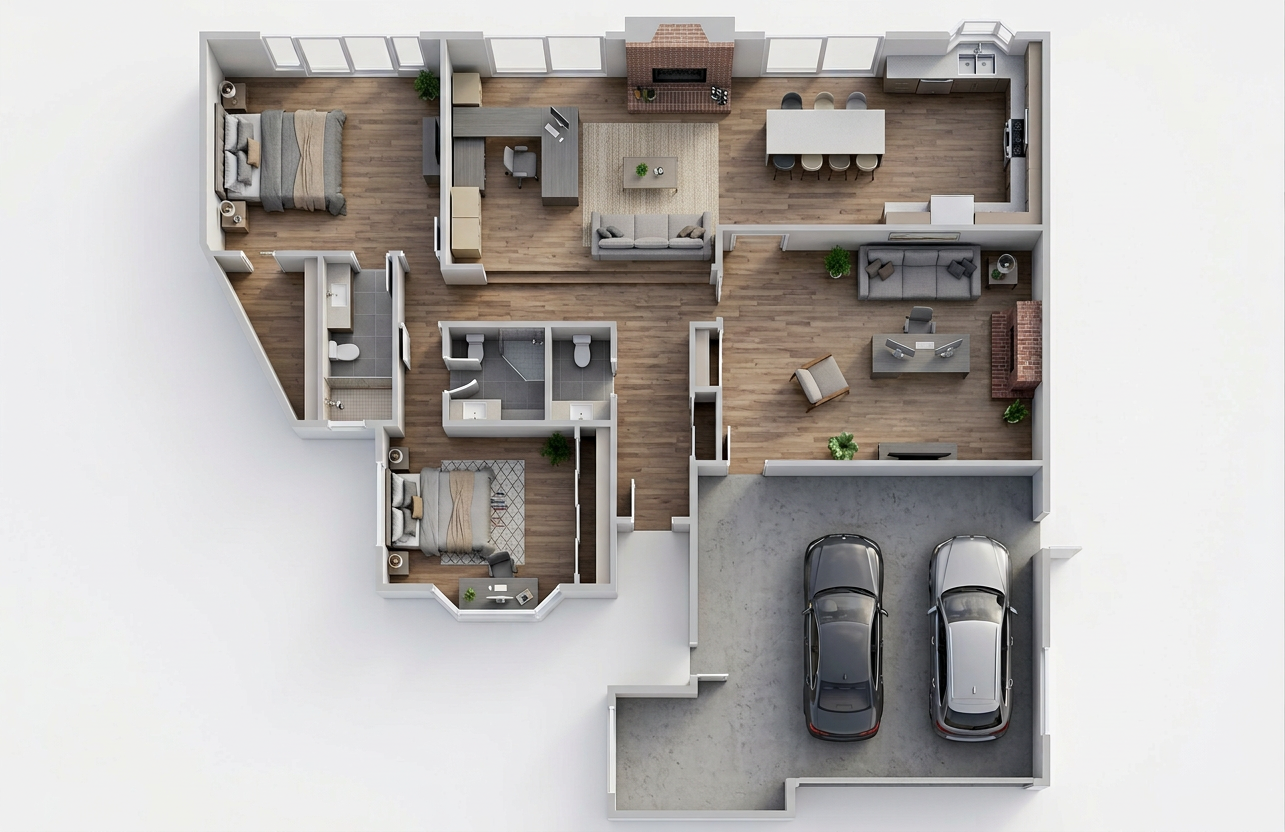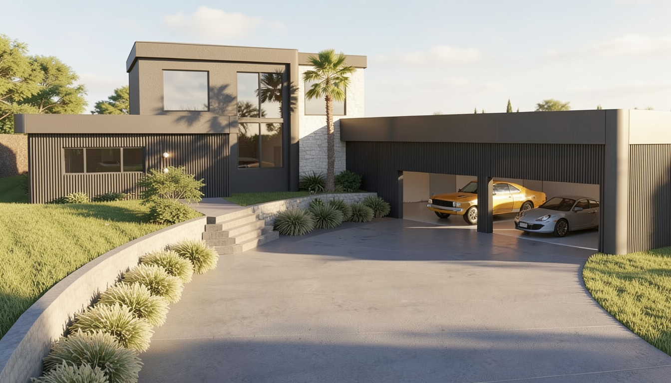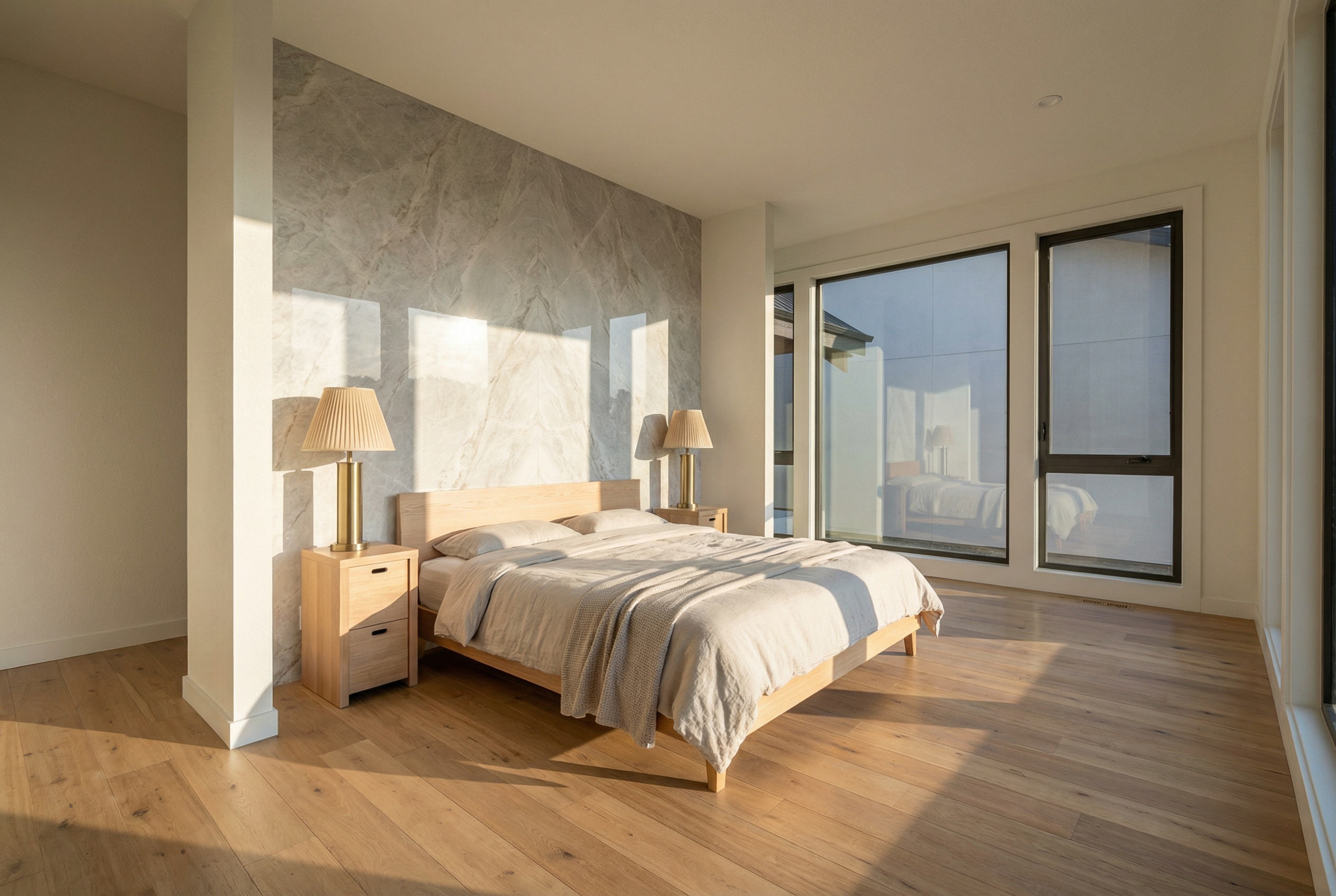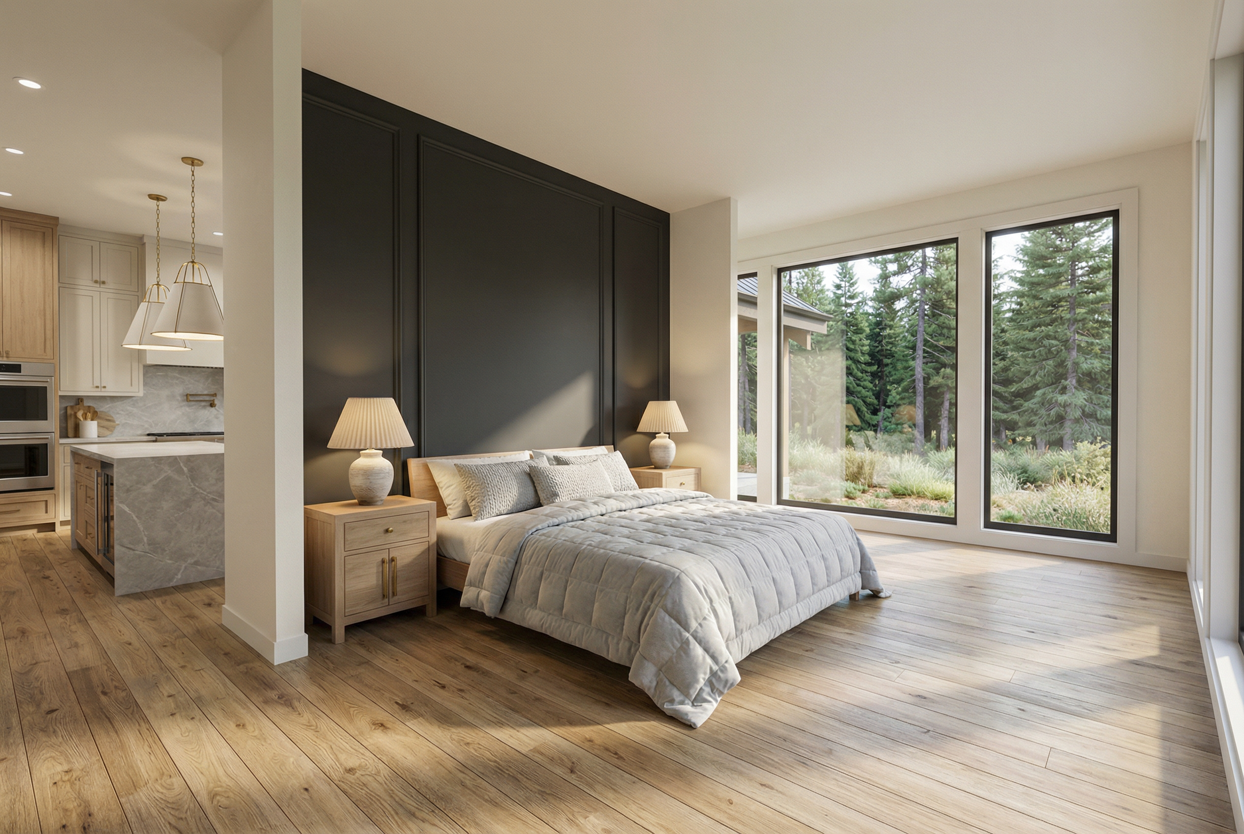 enhance the realism of the existing architectural design while maintaining the same materials and textures focus on realistic lighting shadows and surface details to create a lifelike appearance ensure the mixture of wood siding is preserved in the correct areas making them look authentic and cohesive this is in montana add montana landscape with nice landscaping near the house add montana vegetation around the house make wood siding modern vertical 10 wider plank siding natural cedar light warm honey tone clear matte finish clean sharp edges minimal knots contemporary scandinavian farmhouse style high end residential exterior the siding is not board and batten it is wide planks with realistic wood grain texture make the wood siding planks the same width as the image reference do not add a chimney add mountains far off in the distance do nice landscaping in front of house and and native montana vegetation in forground dont add chimney nice yard in foreground