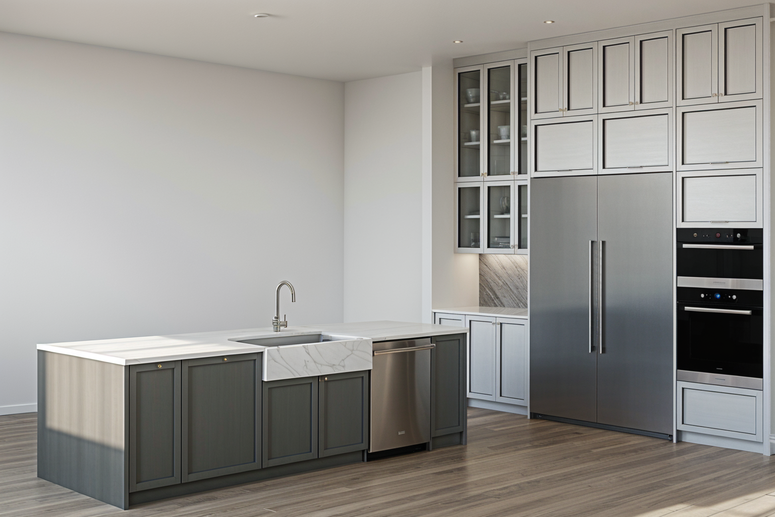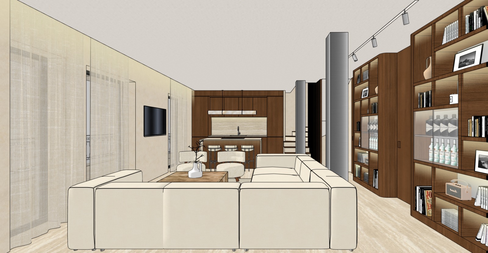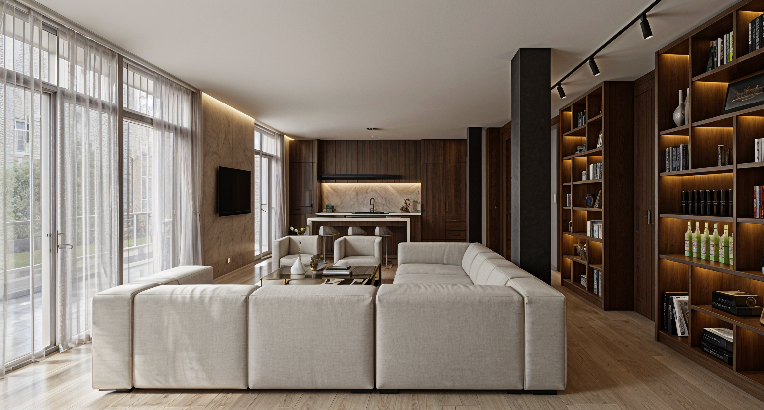 photo realistic modern open plan apartment interior luxurious kitchen and living room high end contemporary furniture travertin island and floor cream sofa wood walnut cabinetry shelving with books and decor glass partition chromed inox pillars natural daylight streaming from large windows captured with a canon eos r5 and 35mm lens soft natural shadows elegant styling lifelike textures hd quality ar 16 9 v 6 0 style raw s 500