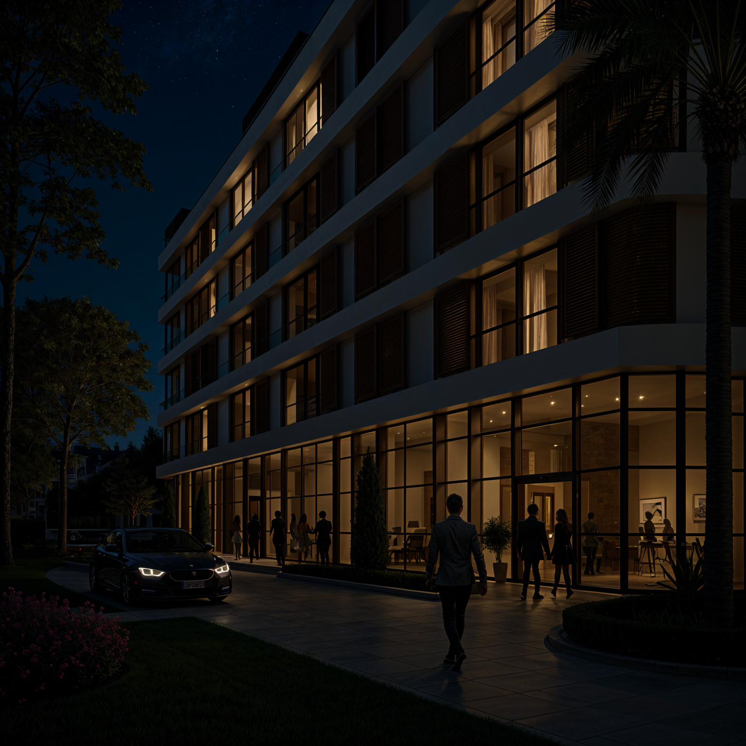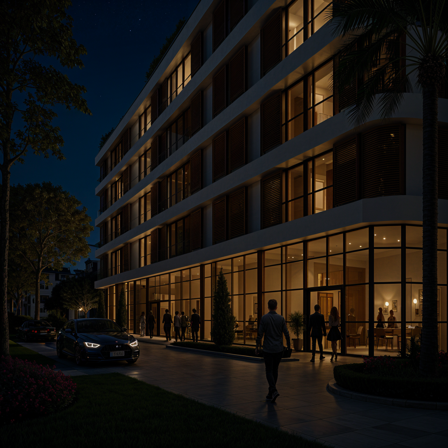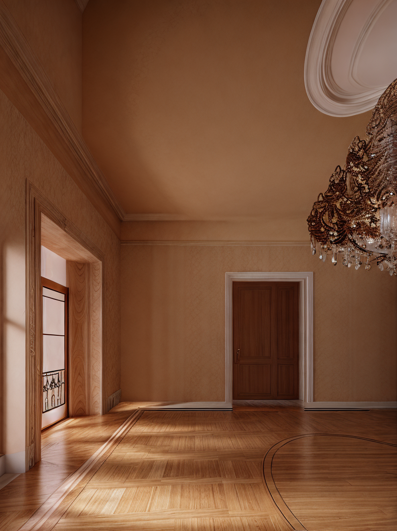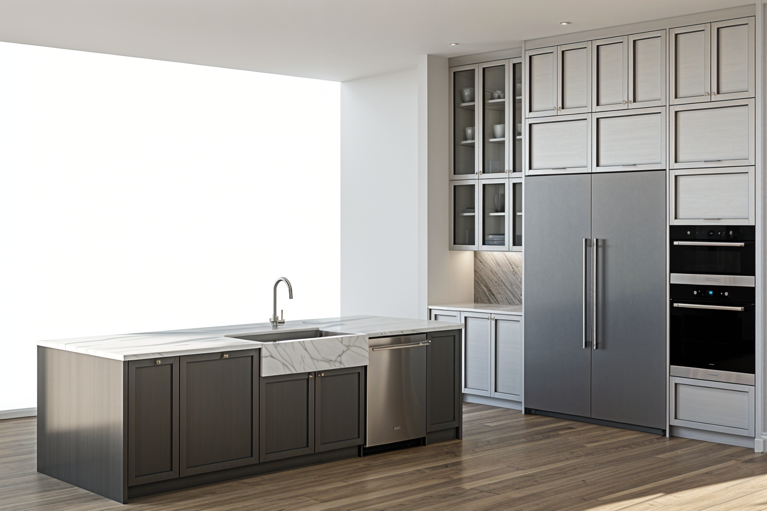 photo realistic modern open plan apartment interior luxurious kitchen and living room high end contemporary furniture travertin island and floor cream sofa wood walnut cabinetry shelving with books and decor glass partition chromed inox pillars natural daylight streaming from large windows captured with a canon eos r5 and 35mm lens soft natural shadows elegant styling lifelike textures hd quality ar 16 9 v 6 0 style raw s 500