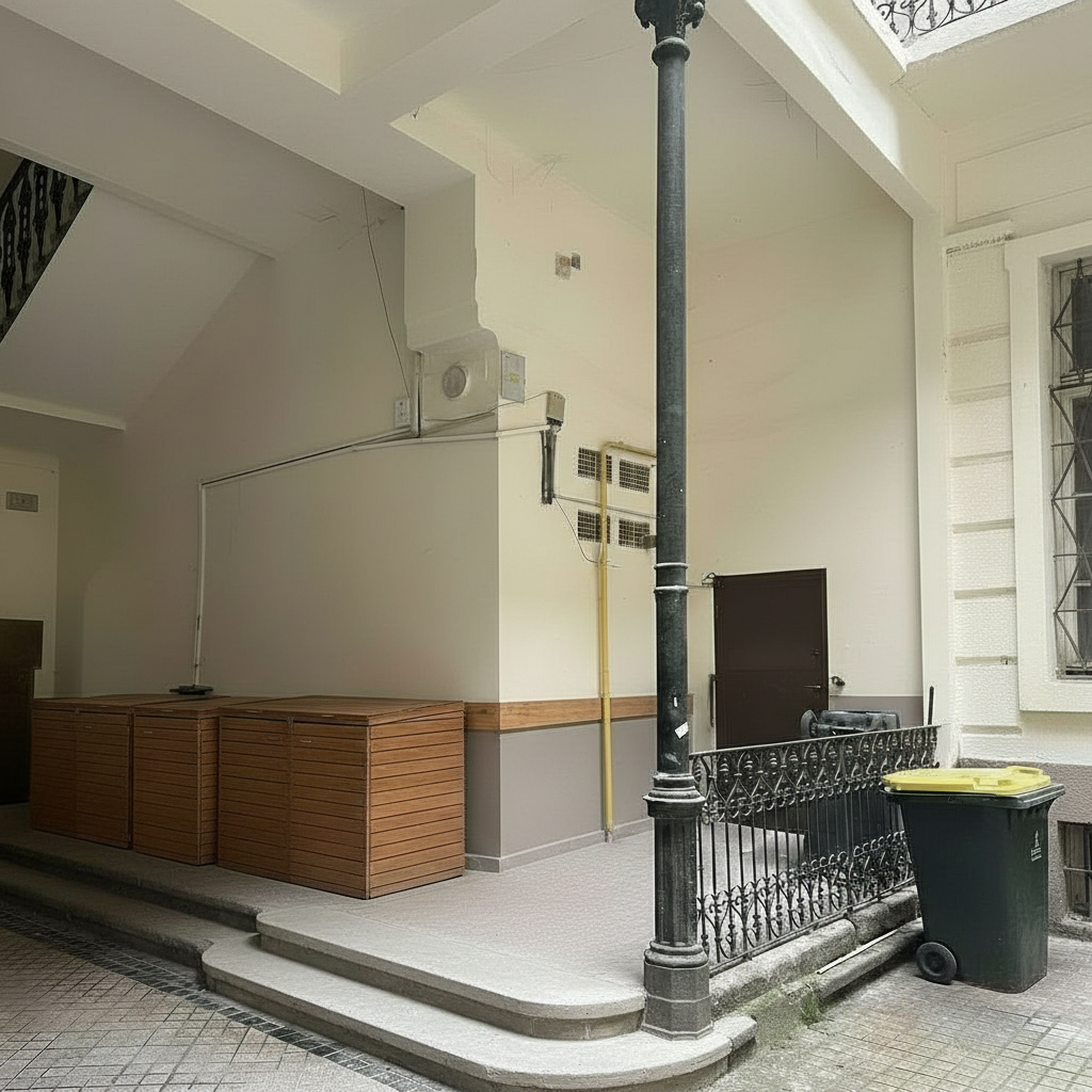 move the wooden boxes aligned nice and tidy next to each other repair the broken steps make them look new keep everything else as is