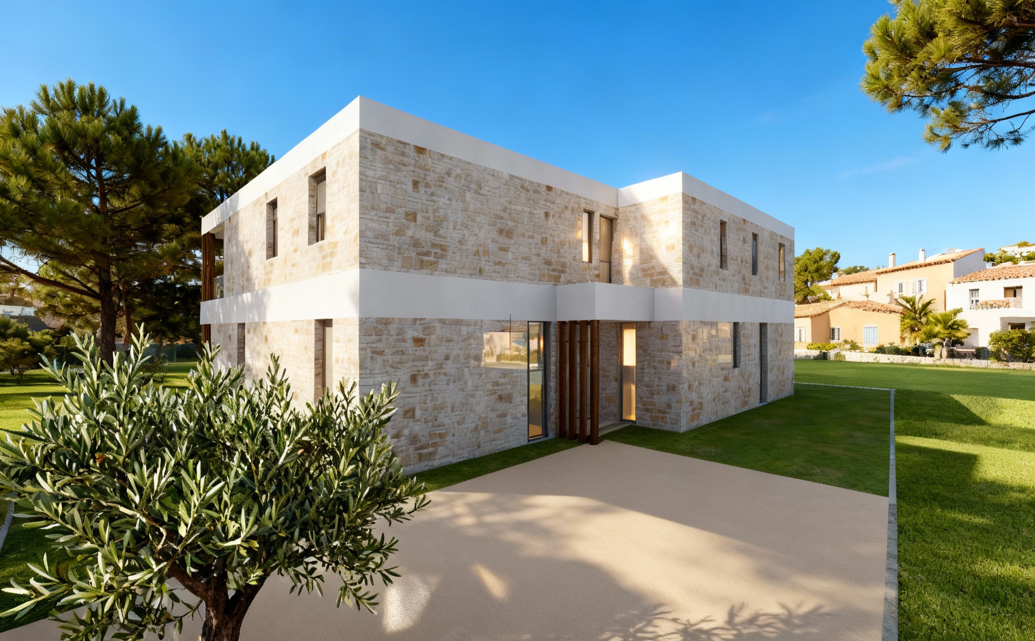 perspective shot modern apartment building with a sleek monochrome design the fa ade features grey and white accents with large geometric windows the roof is dark gray offering a contemporary touch the surrounding landscape is very suburban with vibrant greenery of the lush trees and well maintained grass in light green shades the atmosphere is bright and welcoming with soft natural lighting highlighting the architectural details a few people walk casually along the sidewalk and a modern car passes nearby complementing the urban setting architecture