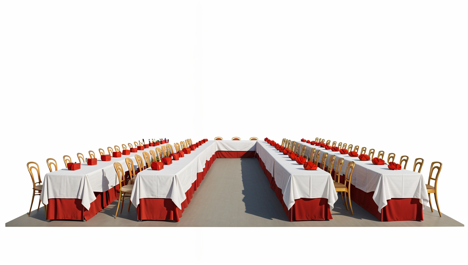 tovaglie pi realistiche con delle pieghe una bianca sopra di altezza 15 cm e una rossa sotto su ogni tavolo inserisci una fila di 15 berrette da cardinale equidistanti architecture