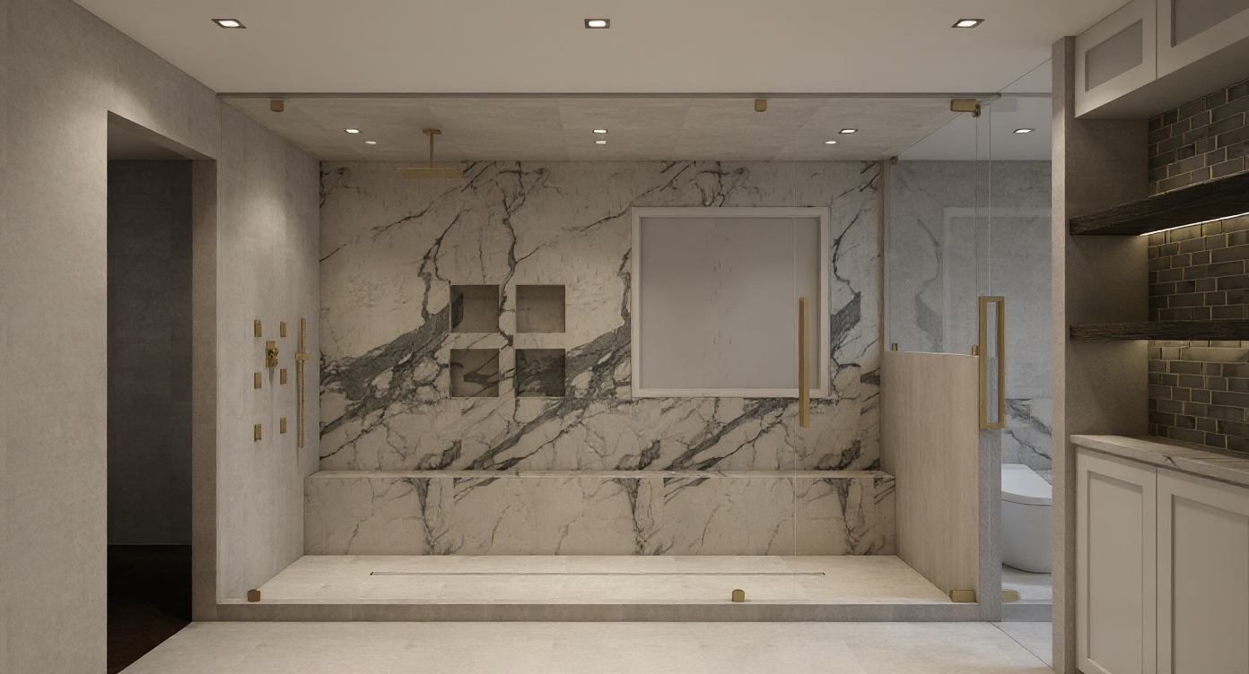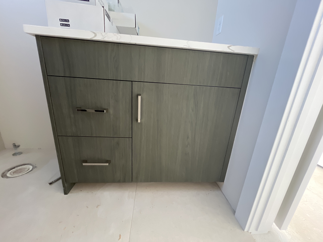 add toilet add flooring remove boxes from countertop add mirror light sconces
