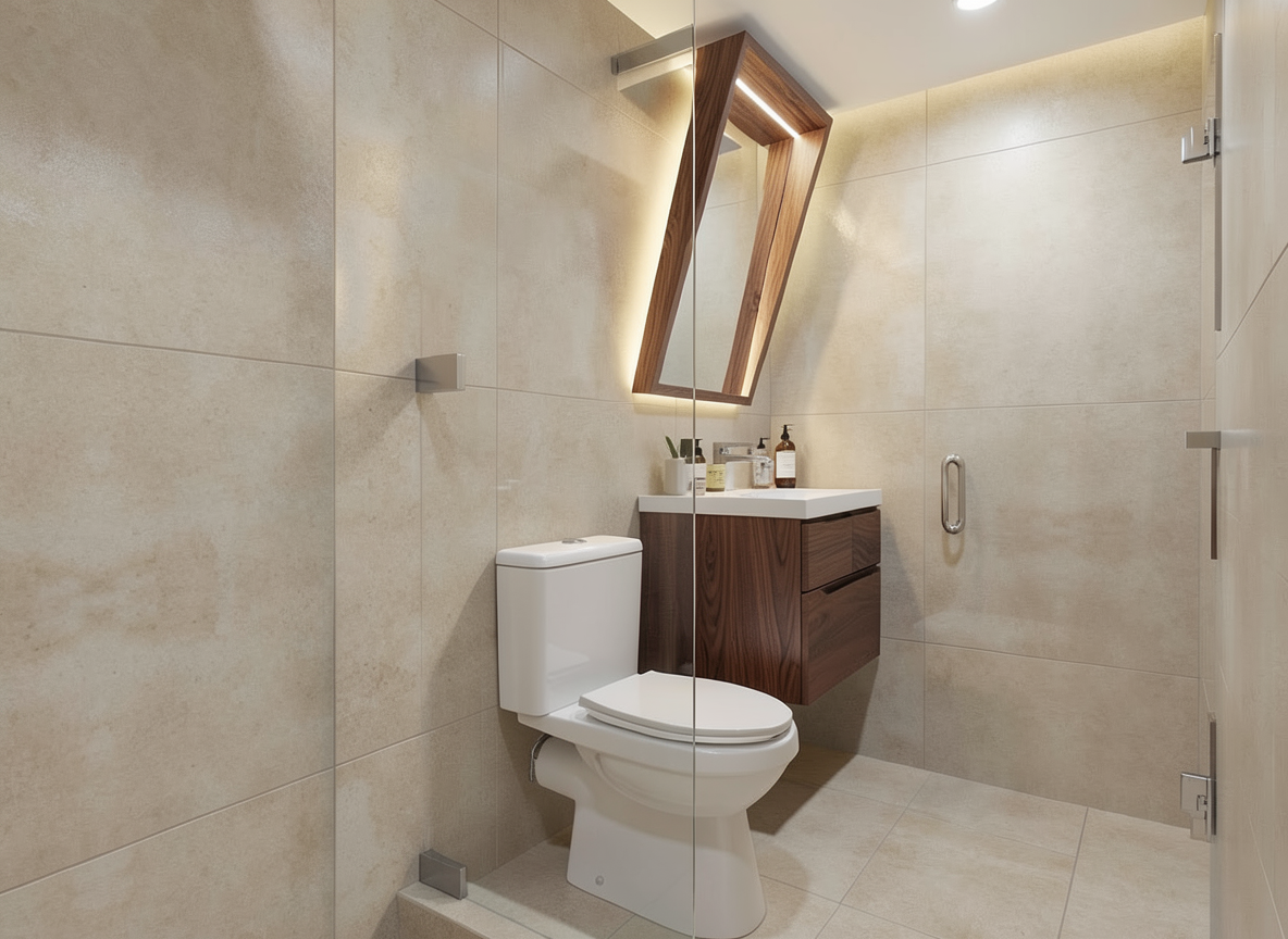 two doors vanity cabinet is made of american walnut wood venner showcasing natural wood grain elegant texture and a high end appearance with a white countertop the surfaces must appear fully seamless continuous clean and subtly reflective with no visible joints emphasizing a smooth monolithic look the walls and floor are finished in medium porcelain tile with a soft texture the ceiling is white the mirror features a perimeter frame in american walnut venner with indirect inlighting producing a soft warm ambient glow that enhances depth and highlights material textures the shower doors are made of tempered glass with stainless steel hardware add bathroom accessories and decoration for a realistic and elegant ambiance change the size of the porcelain tiles to a little more smalll medium beige porcelain tiles featuring a subtle textured surface for added depth and realism the toilet should be one piece design