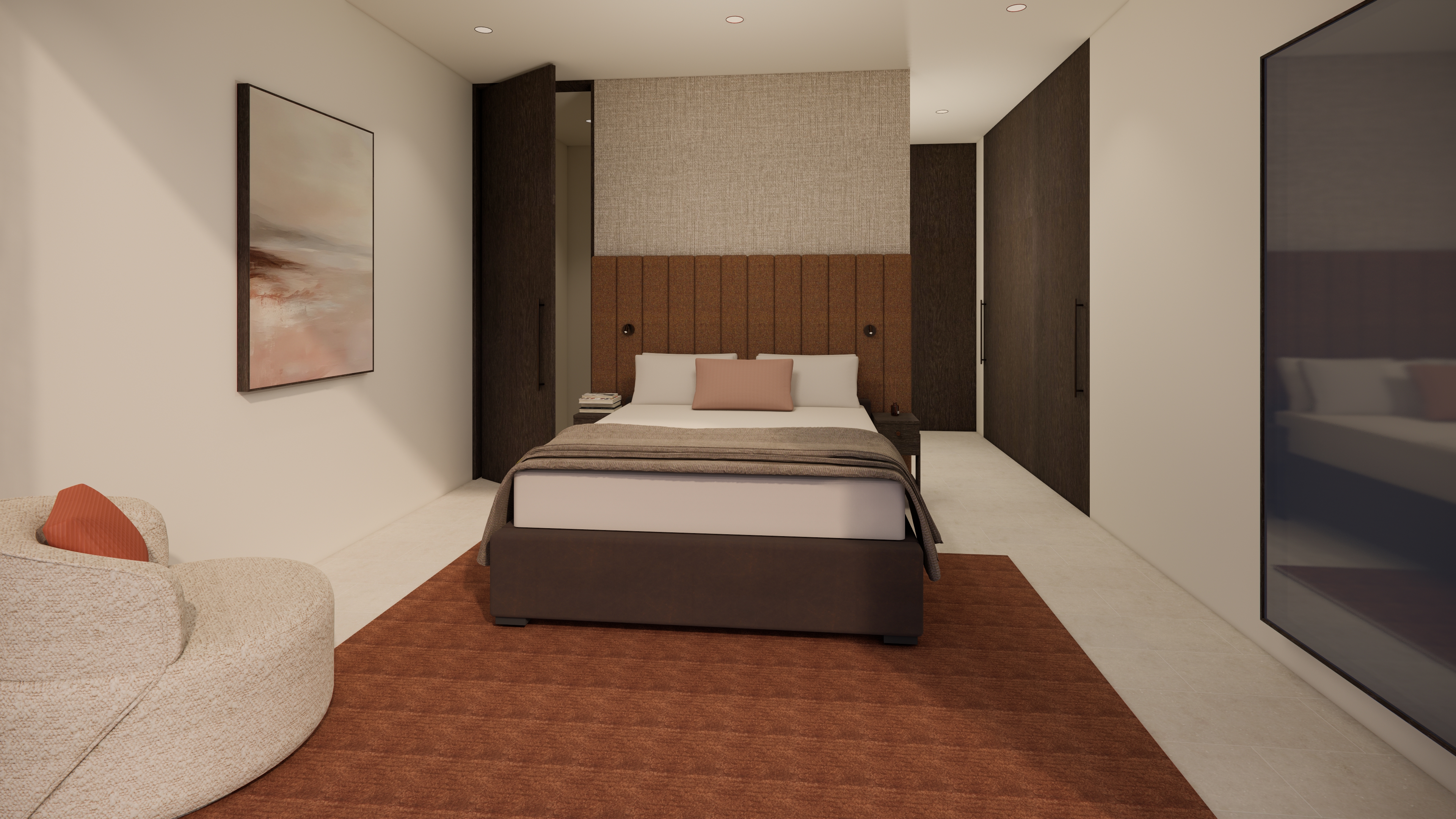 improve the photorealism of this enscape render keep all materials fabrics colours and furniture exactly the same no material changes no new objects only enhance lighting natural shadows reflections and exposure make rug texture seamless