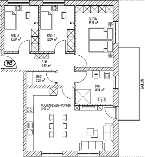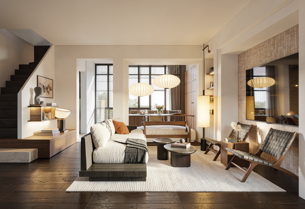 convert this floor plan into a realistic isometric 3d view of a full house show the space from an elevated angle with furniture walls and details visible interior visualization of a modern apartment with a clean minimalist design focus on contemporary stylish interiors with open spaces and functional layout simple straight lines and high quality materials combined with a neutral color palette white beige gray and natural accents such as wood modern furniture with elegant understated design minimal decorations and carefully placed highlights like designer lighting or select art pieces large windows provide plenty of natural light creating a bright and inviting atmosphere indirect lighting complements the natural light and adds a cozy modern touch kitchen is sleek and minimalistic with smooth fronts integrated appliances and clear organization bathrooms are modern and streamlined featuring walk in showers large format tiles and premium finishes style modern minimalist photorealistic high level of detail realistic lighting and shadows premium real estate visualization use the same furniture as shows on the plan do not change the orientation of the floorplan