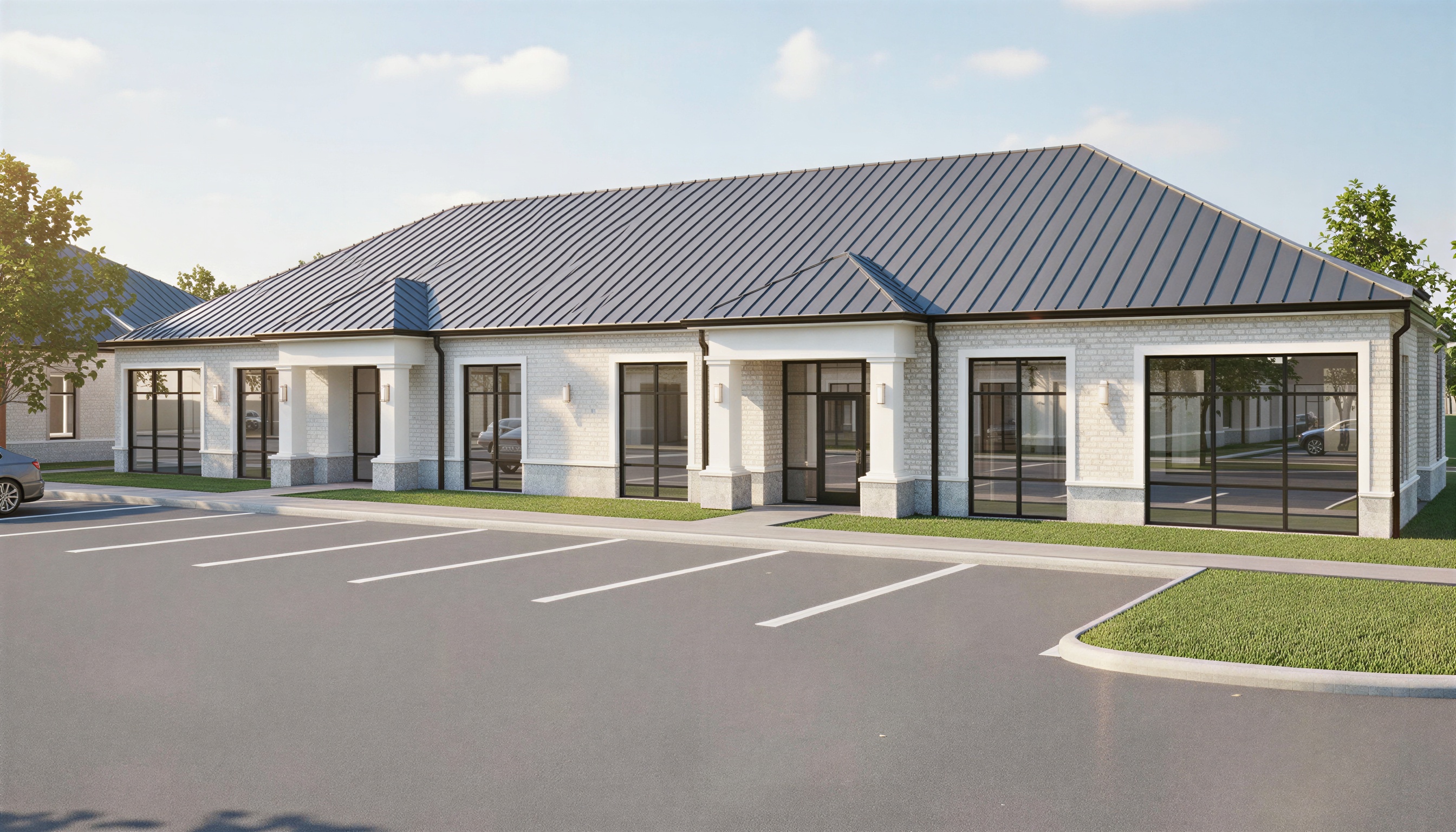 maintain colors textures and increase realism add brightness to light fixtures make as photorealistic as possible while keeping textures the same as selection professional landscaping with good lighting current material style just enhance standing seam metal roof and also base limestone veneer in ashlar pattern