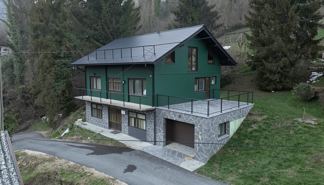 ground floor facade is in dark grey stone color and first floor facade is in dark green color roof is in anthracite black color garage is in stone marble color on the garage roof there is metal railing with small beams remove every furniture doors and windows are new and in dark grey color