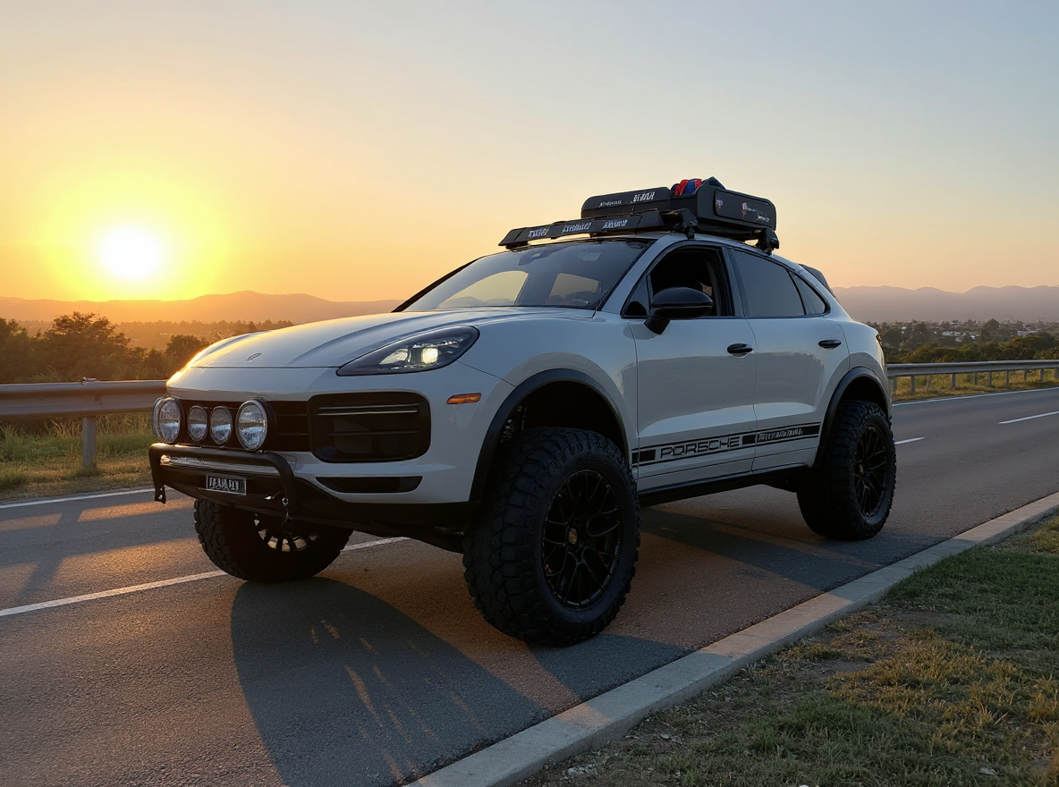 porsche cayenne turbo coupe with offroad tires and a lift put a roof basket loaded with offroad gear and offroad lights add a bull bar with round hella offroad lights on the front bumper and on the roof rack parked on a road side along a califonia highway with the sun setting on the left side