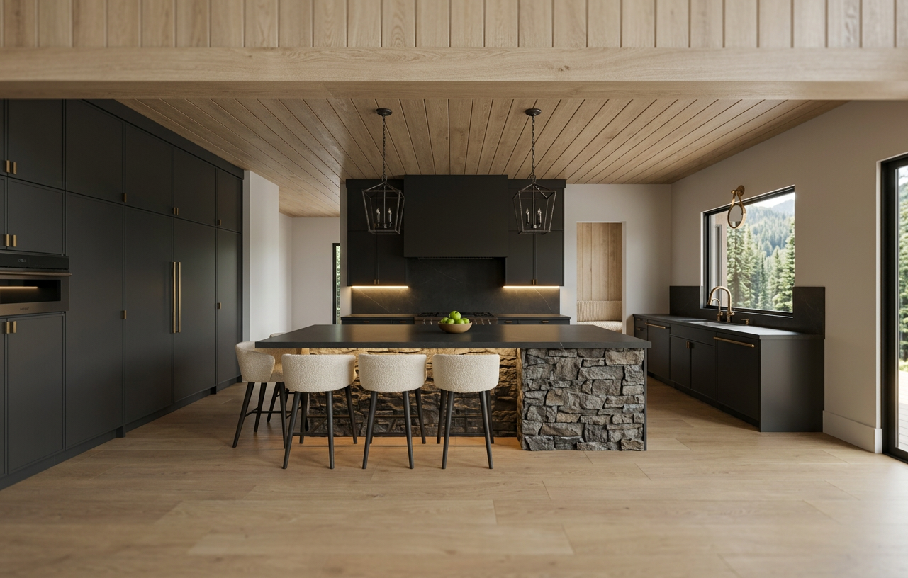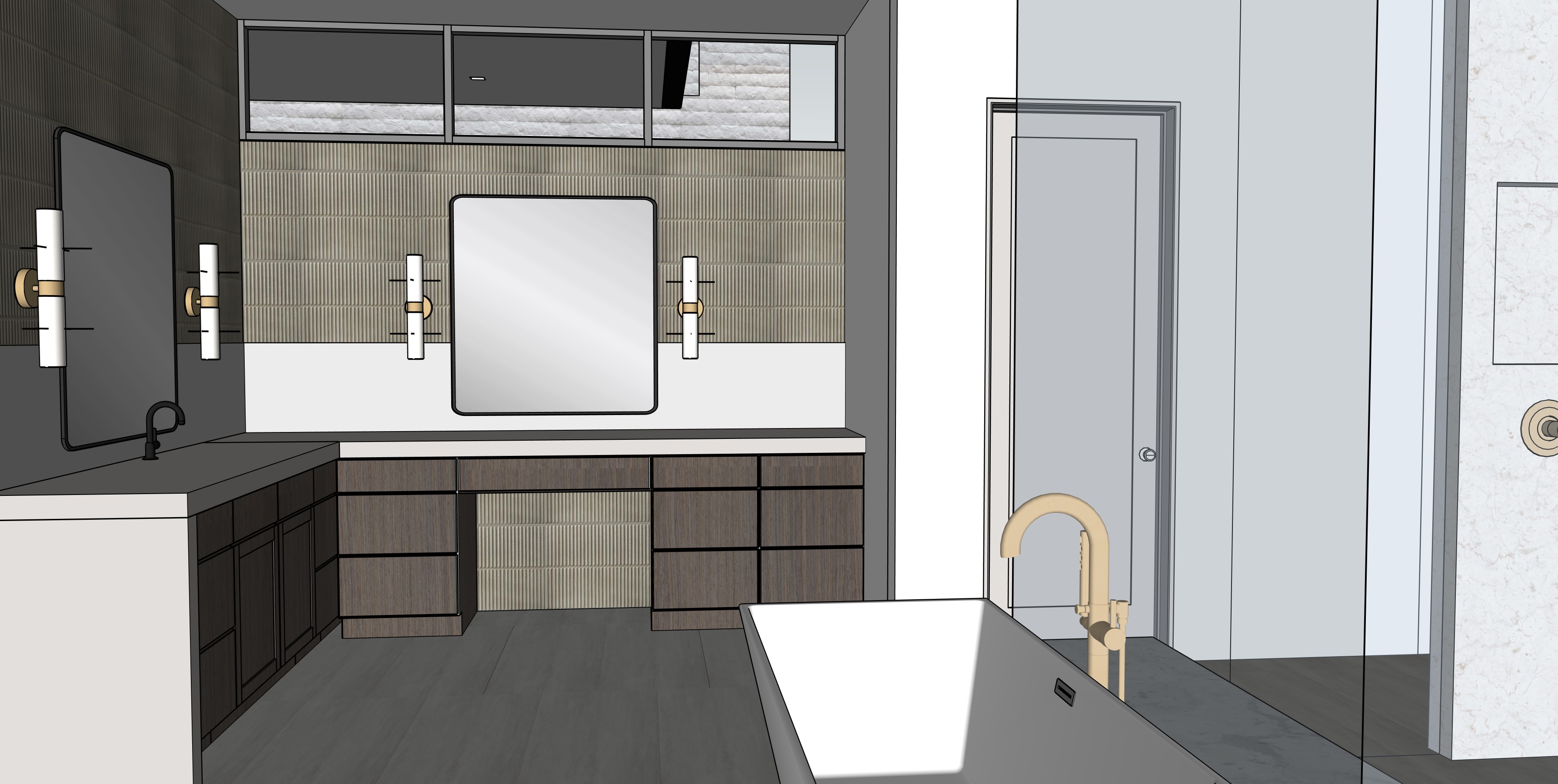 render a sleek ultra modern bathroom with concrete tile floors white walls and ceiling white bathtub plumbing fixtures including tub filler shower controls hand shower and shower heads to be a soft champagne finish the shower to have a soft white onyx walls that are backlit shower bench also the be white onyx clerestory windows with balck frames that let natural light in doors are greige cabinets are dark grey wood with light concrete counters and pencil greige backsplash