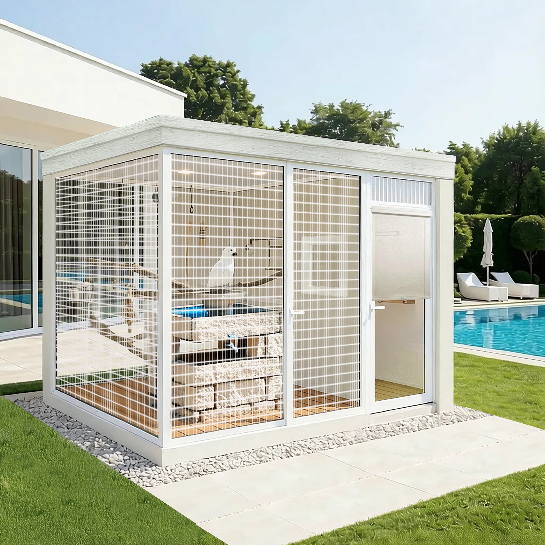 add two white chairs and one round top table in front of the box