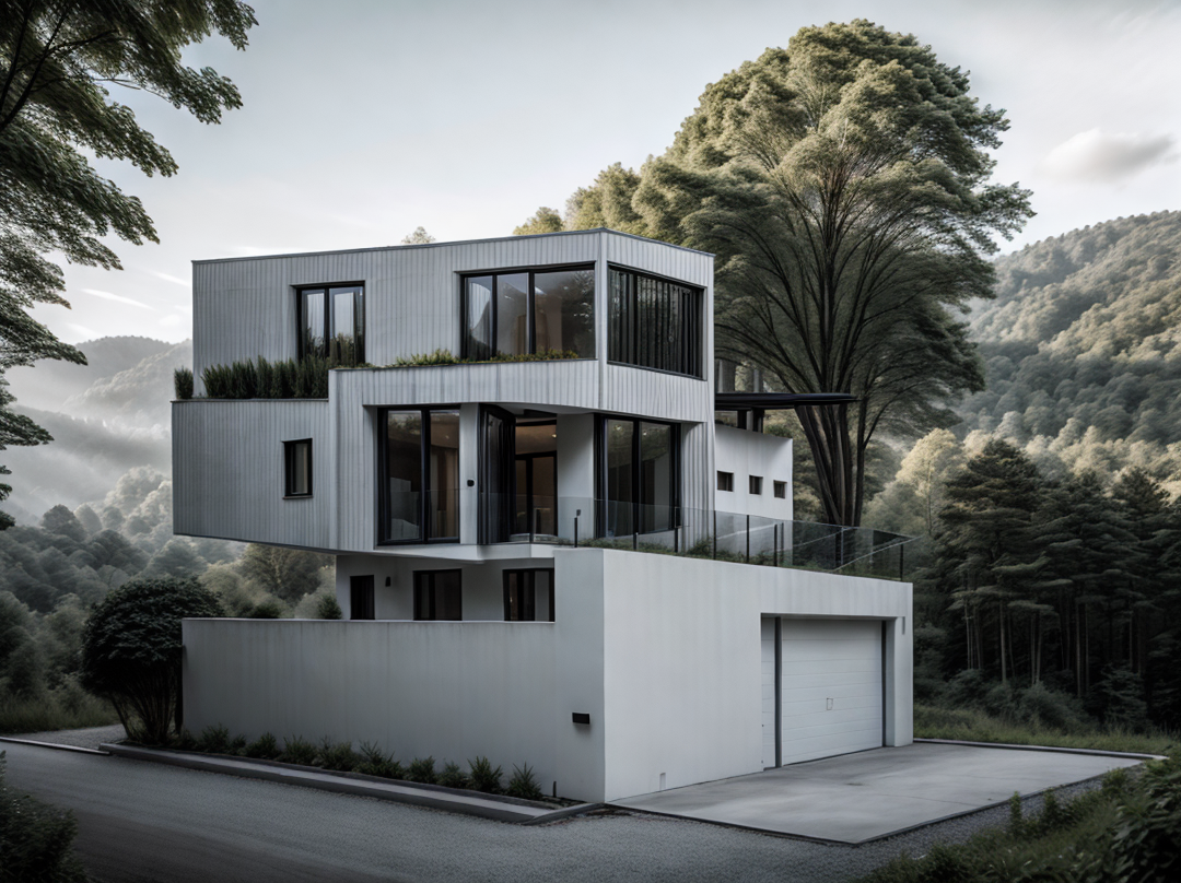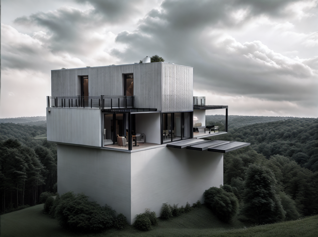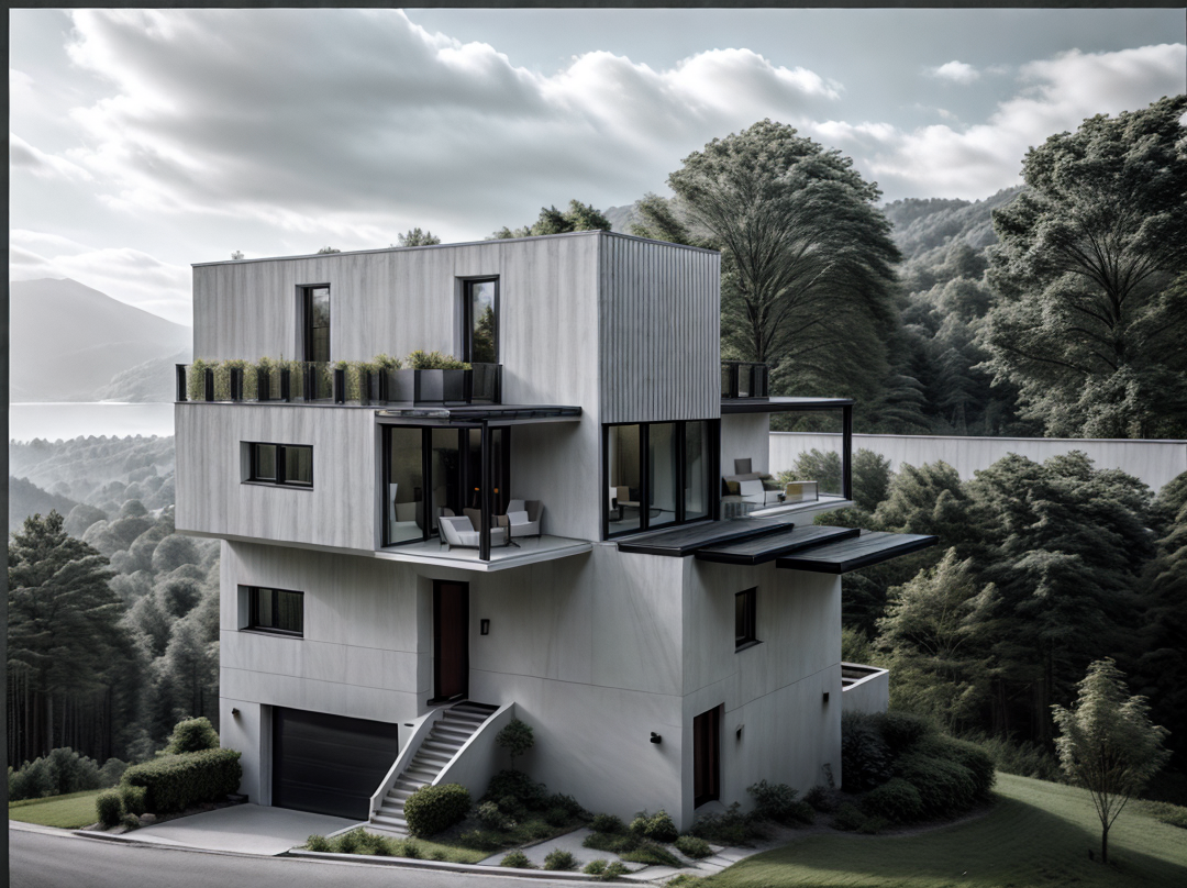 generate a three level organic building with strictly defined stepped massing massing fixed level 1 lowest largest rectangular footprint full width of the building contains the bedrooms front edge extends furthest toward the lake level 2 middle same width as level 1 but with reduced depth shifted backward from level 1 creating a full width terrace on top of level 1 contains the living room the front face of level 2 is exactly one step behind level 1 level 3 top smallest rectangular footprint same width as lower levels but further recessed backward forms a second terrace on top of level 2 pool position very clear on level 3 place a rectangular glass bottom pool the pool must be positioned directly above the living room on level 2 the glass bottom of the pool is the ceiling of the living room no other placement is allowed organic architectural style apply smooth flowing organic geometry across the entire structure while preserving the stepped massing all corners rounded no sharp angles terraces have curved front edges walls and slabs flow into each other with soft radii the three level stepping remains clearly visible despite the curvature fa ades front fa ade lake side shows all three stepped levels each terrace edge forms a curved wave like line level 1 has the largest vertical exposure with curved openings for the bedrooms level 2 fa ade recessed with a large curved glass opening under the glass bottom pool level 3 is furthest back with a low curved fa ade supporting the pool platform rear fa ade hillside levels 1 and 2 partially embedded in the slope with curved retaining walls level 3 emerges cleanly above the slope side fa ades show the stepped volumes clearly level 1 level 2 level 3 all vertical lines bow gently outward or inward corners are rounded and continuous summary constraints stepped geometry must remain exact level 1 largest level 2 recessed level 3 recessed again width alignment preserved across all levels the pool is always on level 3 always above level 2 and its glass bottom living room ceiling curved organic architecture applied everywhere without altering the massing logic architecture