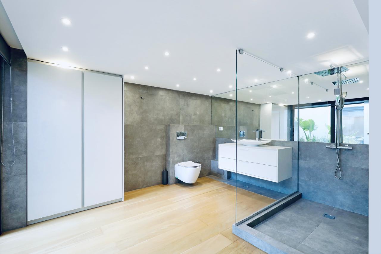 make the bathroom modern and include a sauna