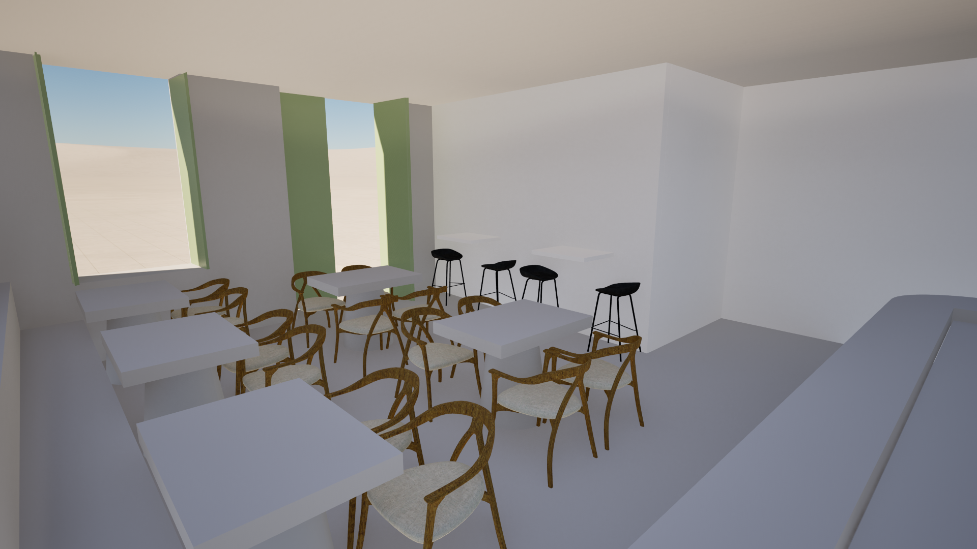 i want you to transform this space for me with the same layout it has into a modern and minimalist restaurant in which beige white and a few tones of green will prevail i want the same style as the reference picture because is the same place keep the same geometry as the first picture make the room of the first picture at the end the black items are stools and the tables are high