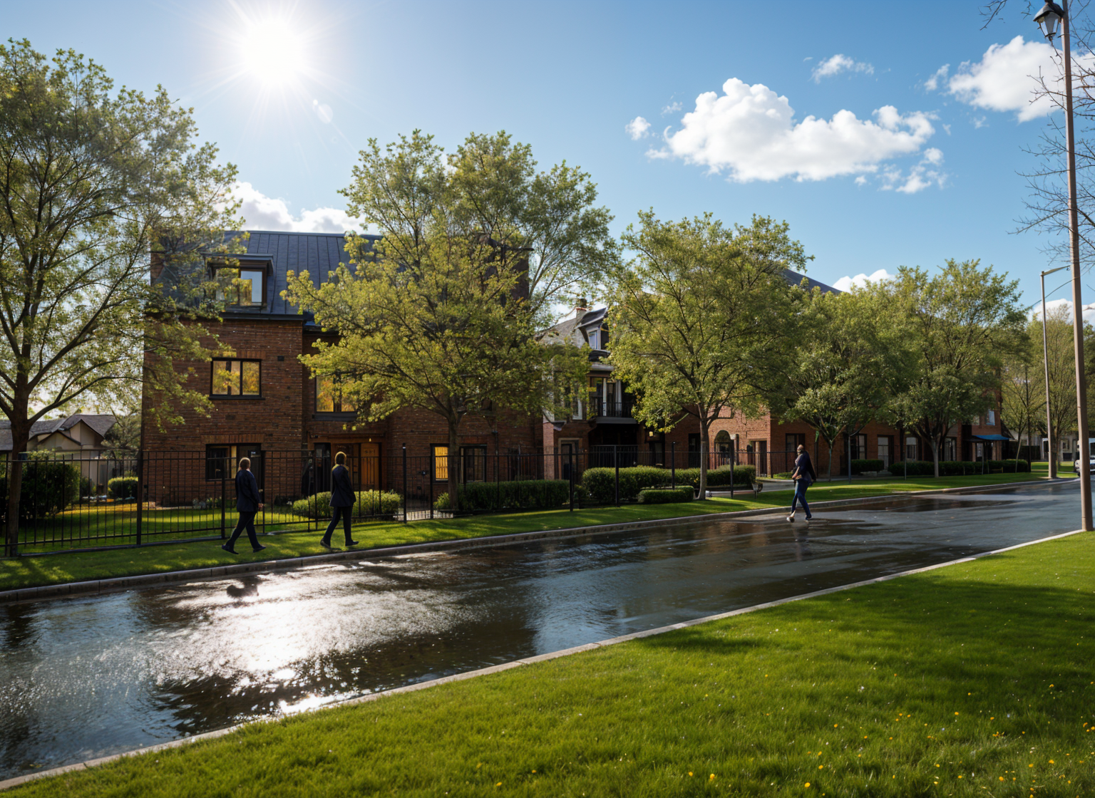 a modern luxurious kitchen with a serene and sophisticated atmosphere the room features sleek grey oak cabinetry with flutted travertine curved cabinets and a large island centerpiece made natural traavertine romano the walls are clad in a soft cashmere hue with panelling complementing the cabinetry appliances are seamlessly integrated adding a touch of contrast overhead lighting is warm and ambient creating a cozy yet refined ambiance the flooring is parquet enhancing the airy feel of the space sparse greenery adds a hint of freshness while maintaining the minimalistic and clean design outdoor light from the right hand side window view is of luxury villa style
