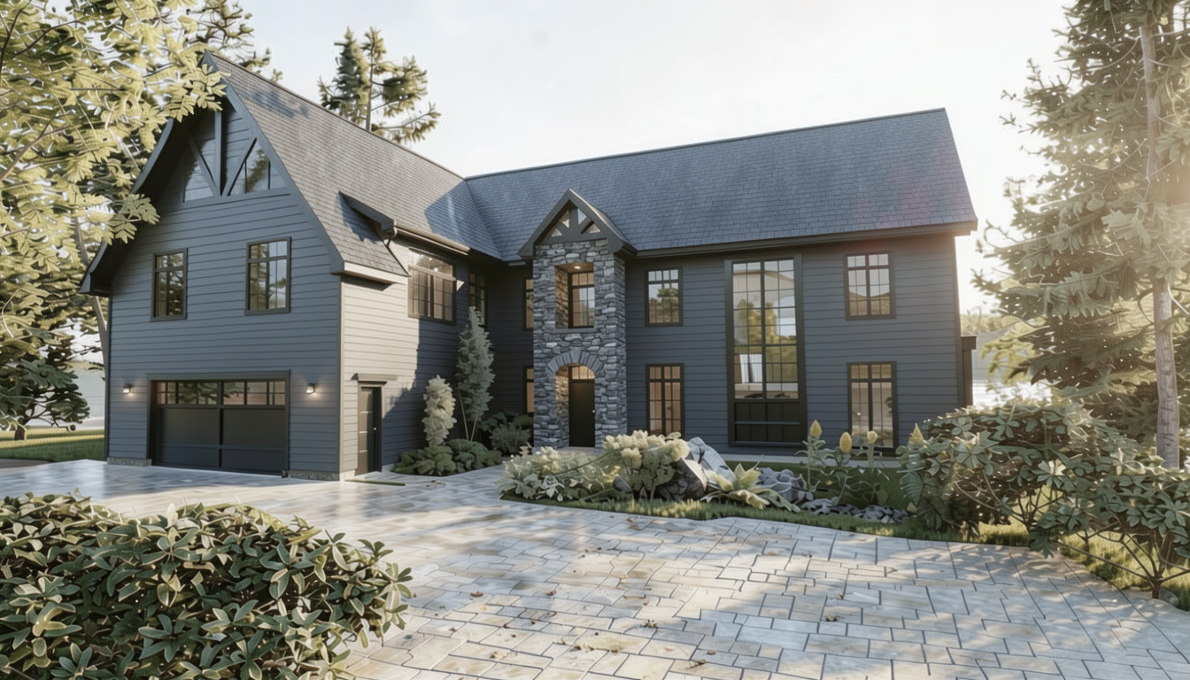 focus only on gable details do not change any siding colors stone windows or lighting remove all decorative wood trusses in all gables completely delete all timber truss elements diagonal and vertical wood members do not leave any traces or shadows of the trusses treat them as non structural decorative elements rebuild gable faces cleanly fill the entire gable face with continuous cedar shingles match the exact same shingle color scale and pattern already present ensure a smooth uninterrupted surface with no framing elements entry gable stone remove trusses above entry keep stone exactly as is do not add any wood or shingles to this area important no other changes anywhere do not modify siding roof windows or proportions