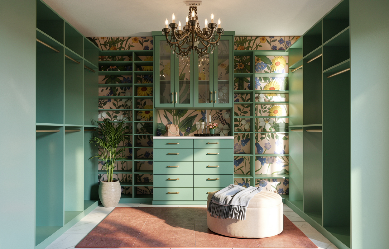 make photorealistic and keep all colors the same add hanging clothes to the rods and shoes to the shelves