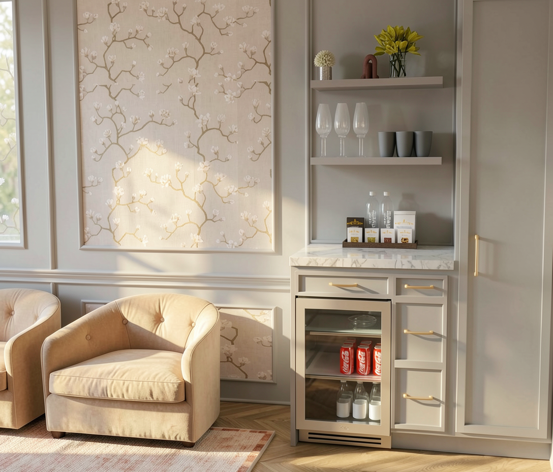 preserve all interior design elements exactly as shown do not change the architecture layout materials furniture lighting ceiling elements millwork workstation arrangement window treatments camera angle or composition add exactly 10 professional office workers in modern business casual attire naturally working collaborating and moving through the space add a subtle realistic downtown daylight skyline view from approximately the 14th floor keep the image polished believable bright and not overcrowded