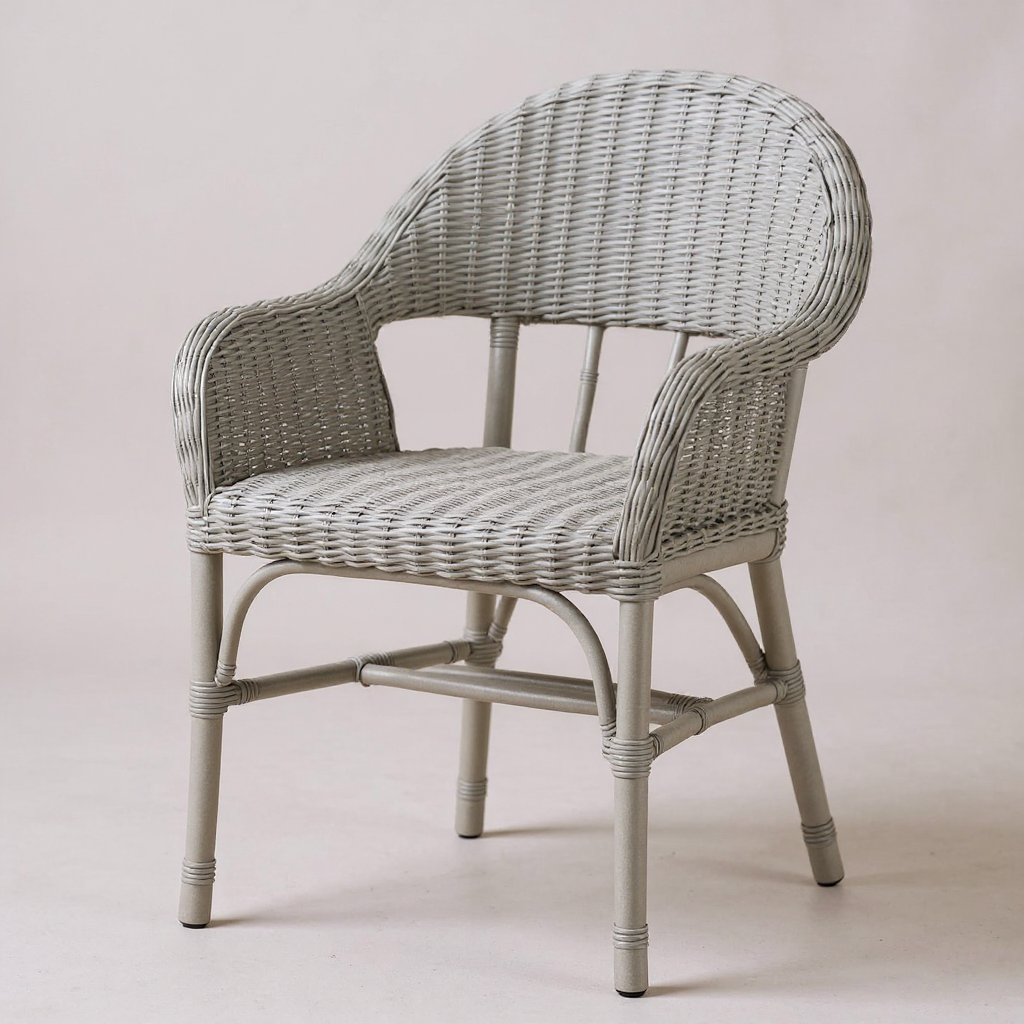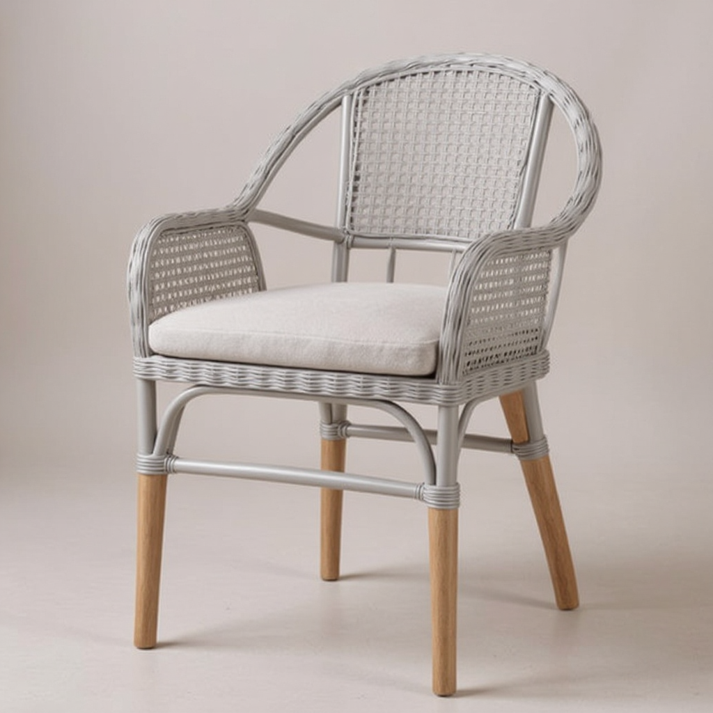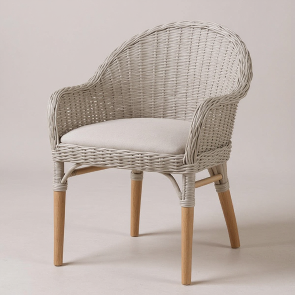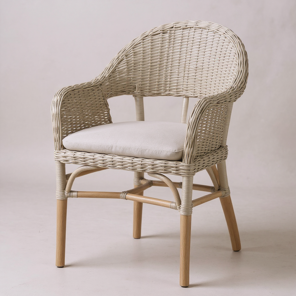 back in raffia weaving in light ivory grayish wire brush finish wooden legs white fabric seat