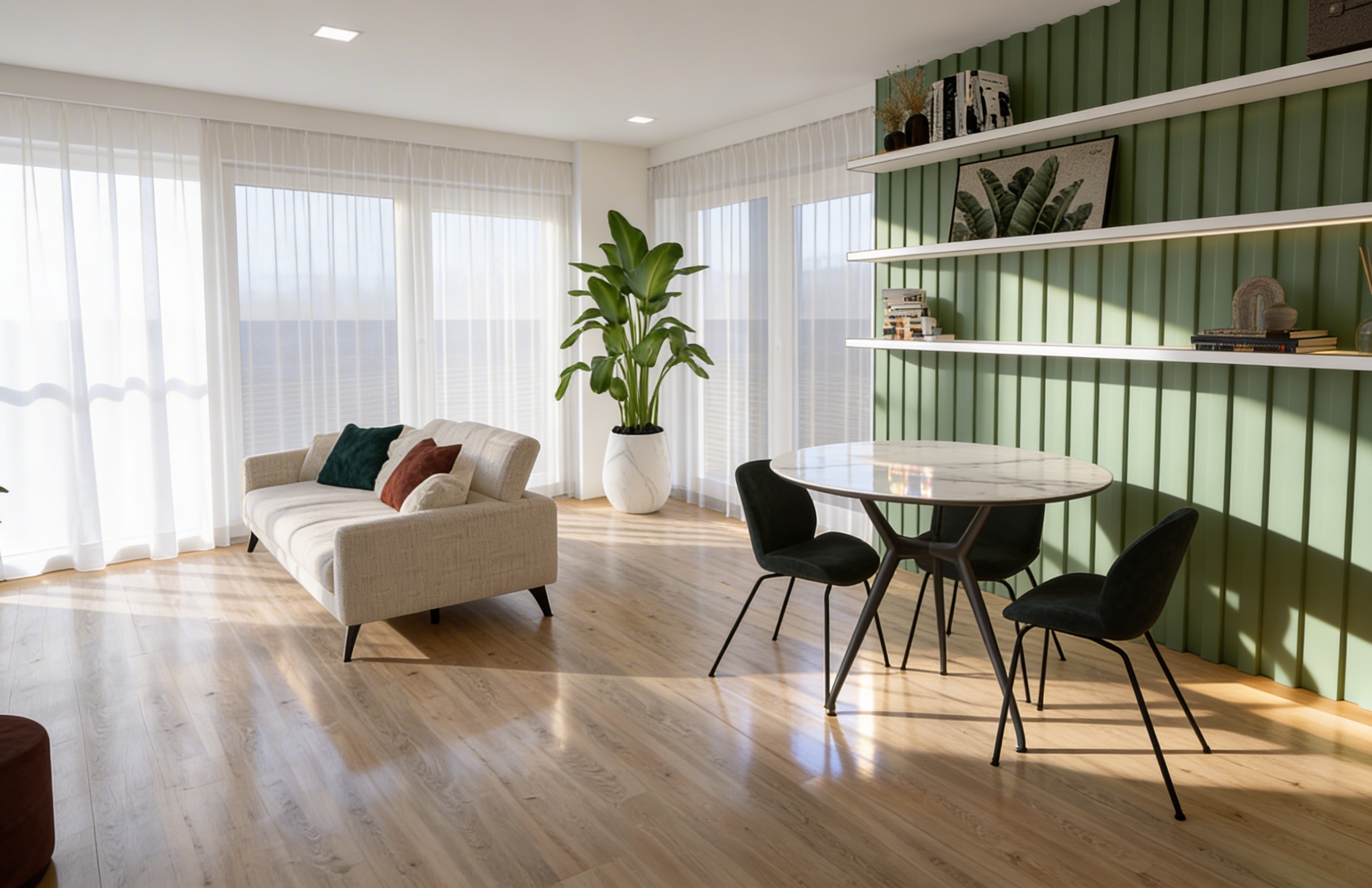 prompt di correzione stessa angolazione keep exact same camera angle framing furniture layout and lighting direction do not change composition apply only the following corrections 1 fitwall renderlo realistico replace the current green wall with a highly realistic porcelanosa fitwall style panel requirements deep vertical rounded ribs not shallow grooves clear 3d depth between ribs soft shadow gradient between each rib matte ceramic resin surface subtle tonal variation not flat green micro texture visible at close range natural shadow under shelves where they meet the wall the wall must look architectural and tactile not plastic or painted mdf no uniform color no flat shading 2 spotlight above the plant replace the current square recessed light above the plant with black metal cone spotlight minimal cylindrical ceiling base matte black finish directional warm beam 3000k visible soft light cone hitting the plant and wall remove any square ceiling light in that position 3 floor correction adjust parquet tone light oak with cooler grey undertone less honey less yellow warmth slight desaturation matte finish realistic wood grain variation subtle daylight reflection 4 curtain correction the sheer curtain near the sofa must exist only in front of the actual window do not extend curtain across entire wall curtain width must match window width wall sections without window must be clean and without fabric realistic soft folds and translucency lighting keep same natural daylight direction keep same soft shadow on floor keep same warm interior atmosphere no change to camera exposure ultra photorealistic ray traced shadows high material realism architectural photography style