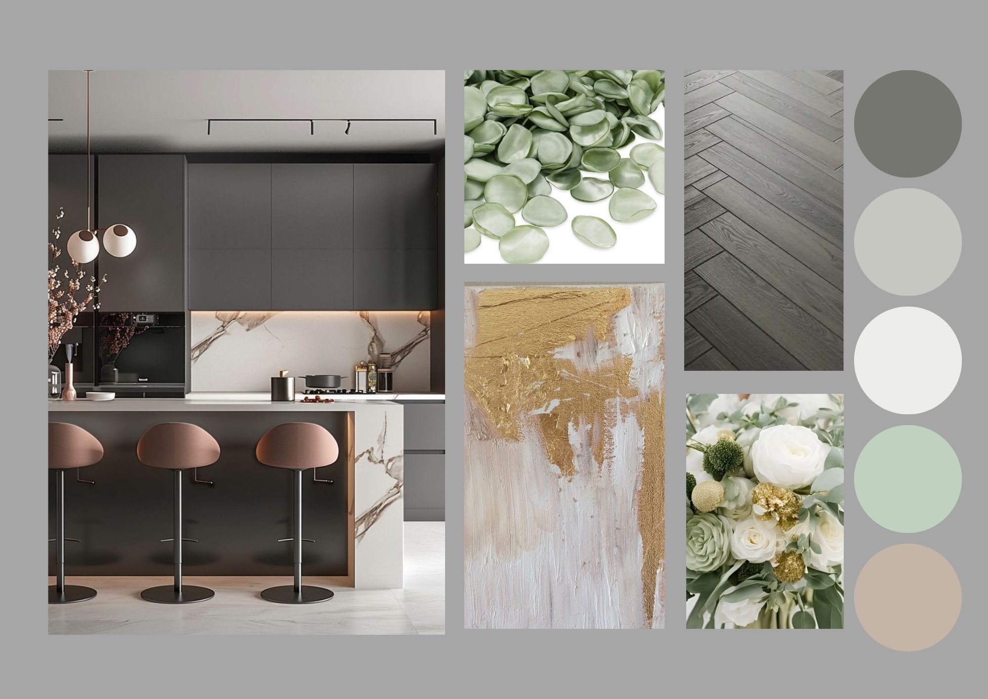 interior shot can you create a render of a kitchen with an island dark grey cabinets and a white worktop with a gold and blush vein light grey herringbone flooring