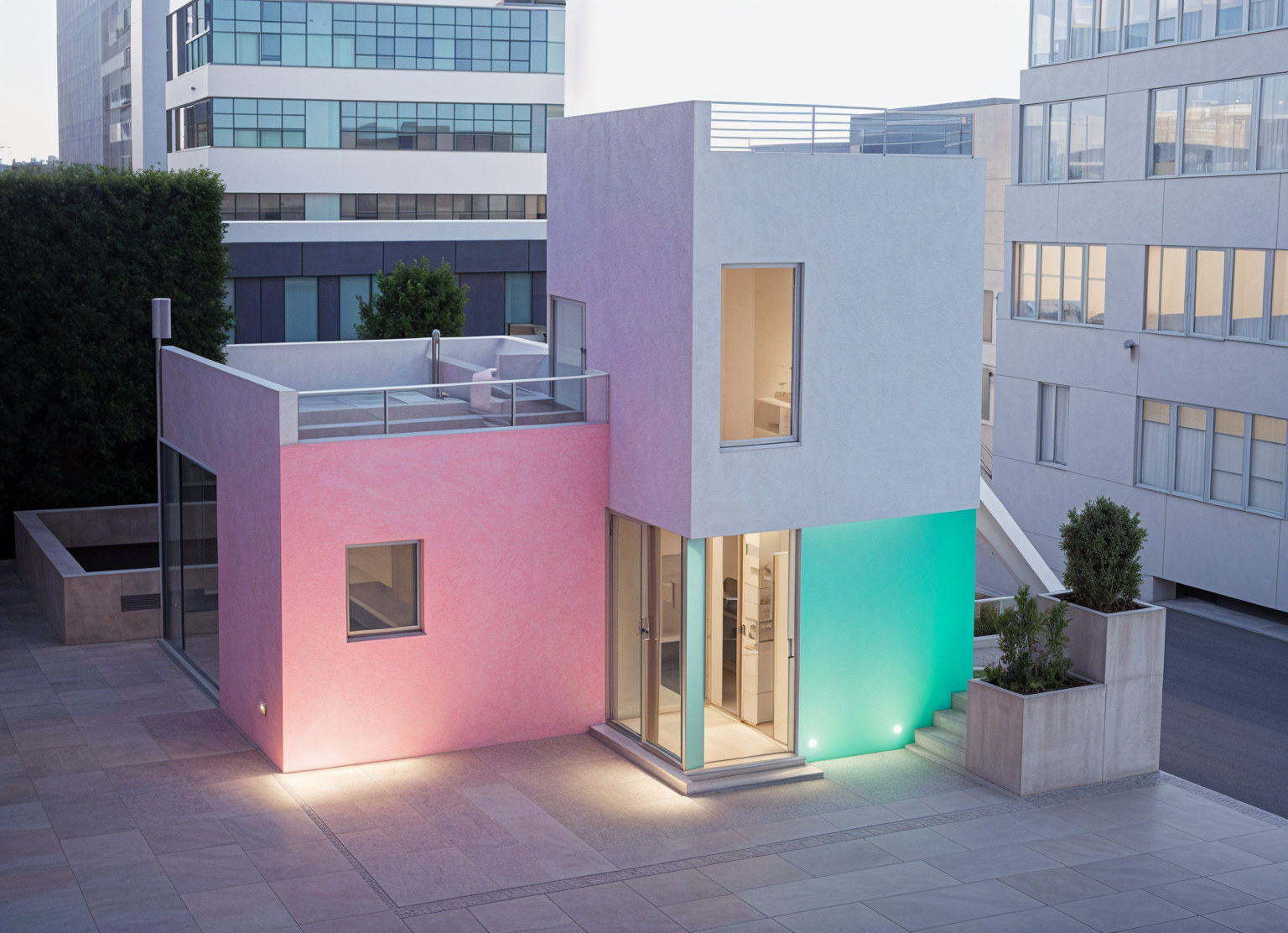 using the block model make a view showing rammed earth walls for ground floor and timber construction for upper floors architecture